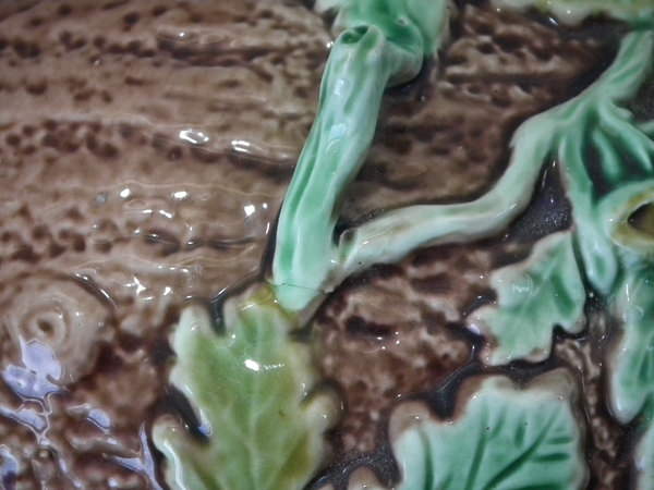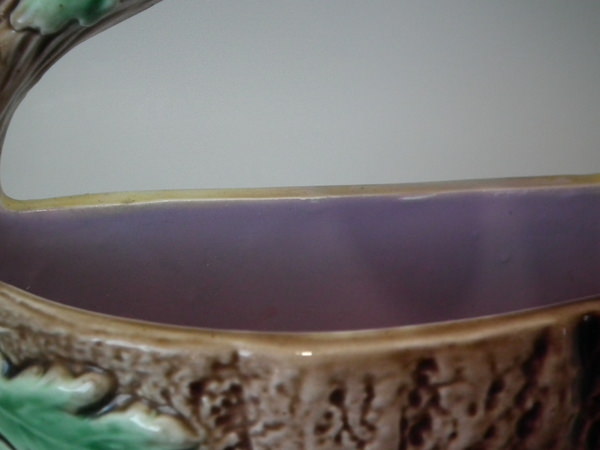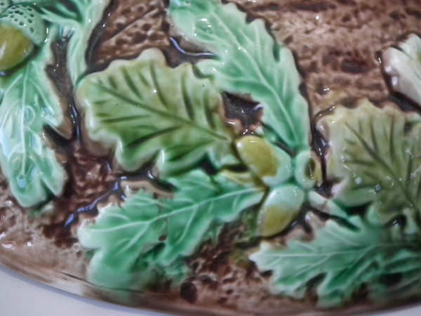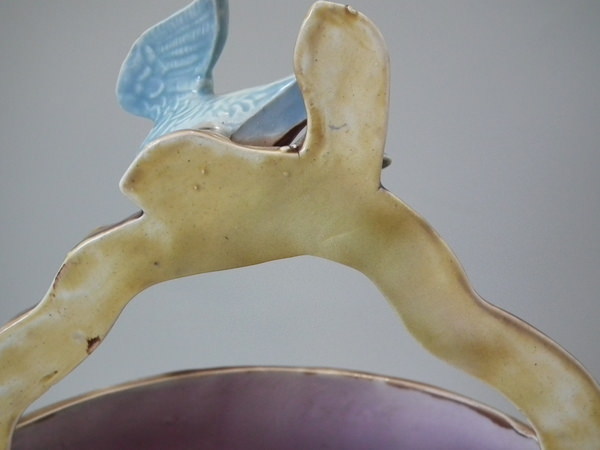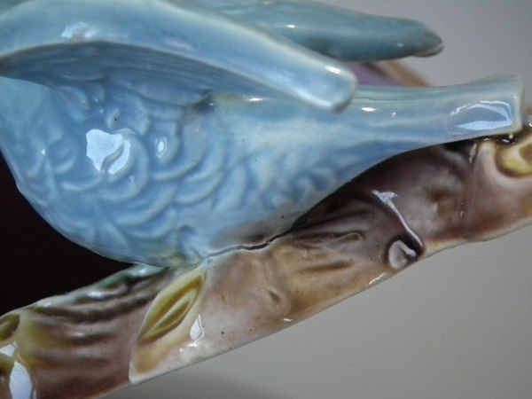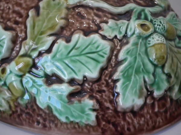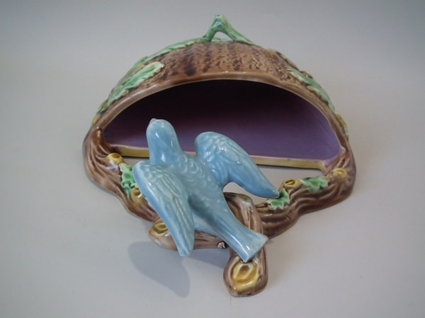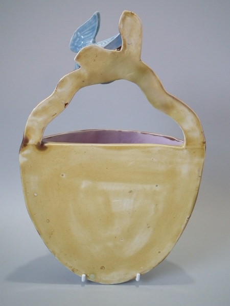 Majolica wall pocket which features a bird and oak leaves/acorns.