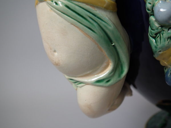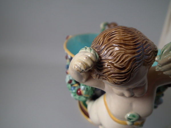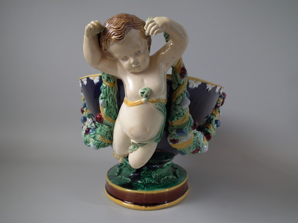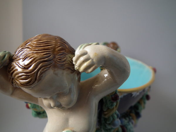 Victorian, circa 1875. 8.3ins high, 19.7ins wide, 9.5ins depth. Holdcroft Majolica centrepiece bowl which features two putti carrying a large bowl with fruiting garlands.