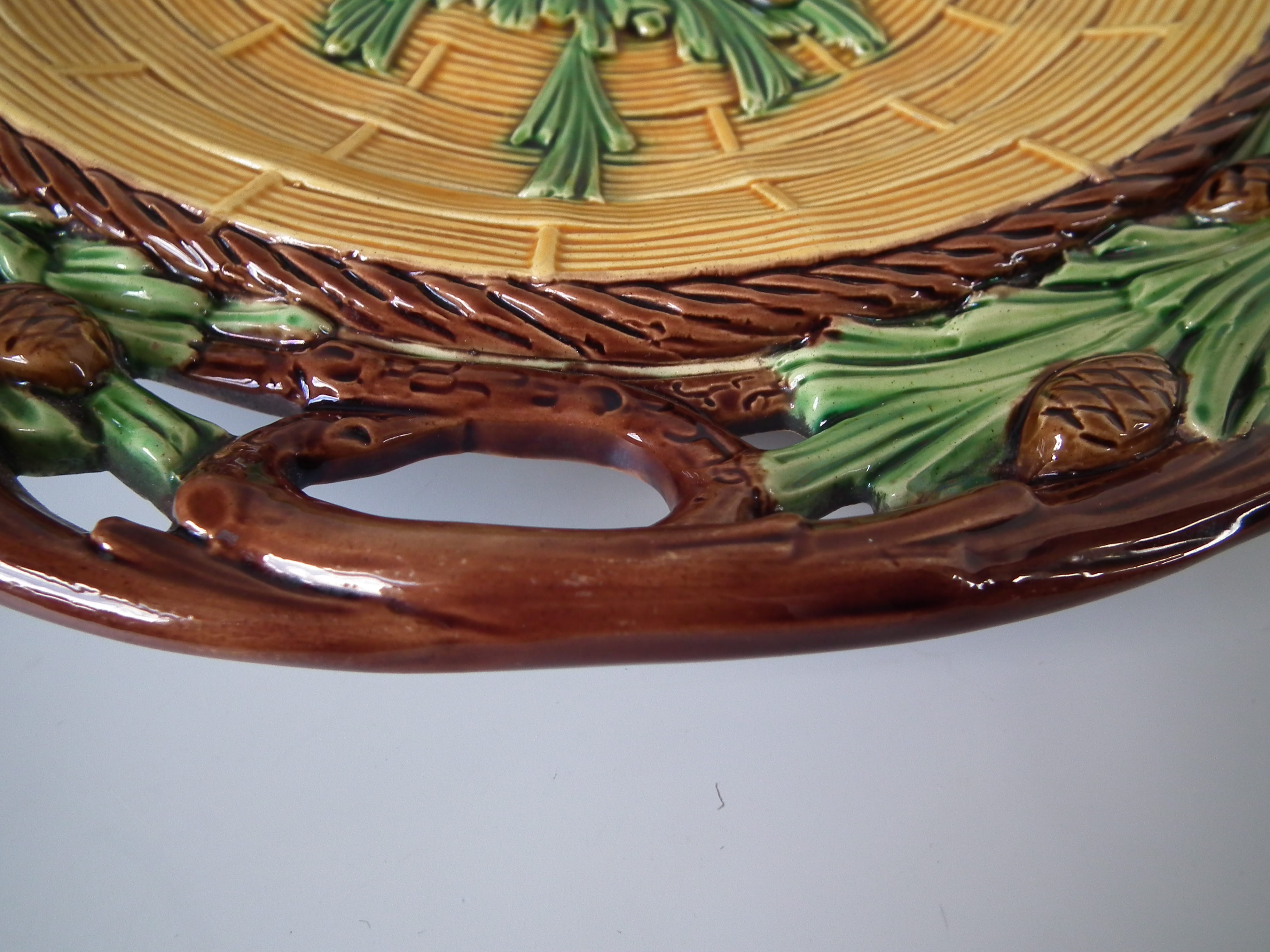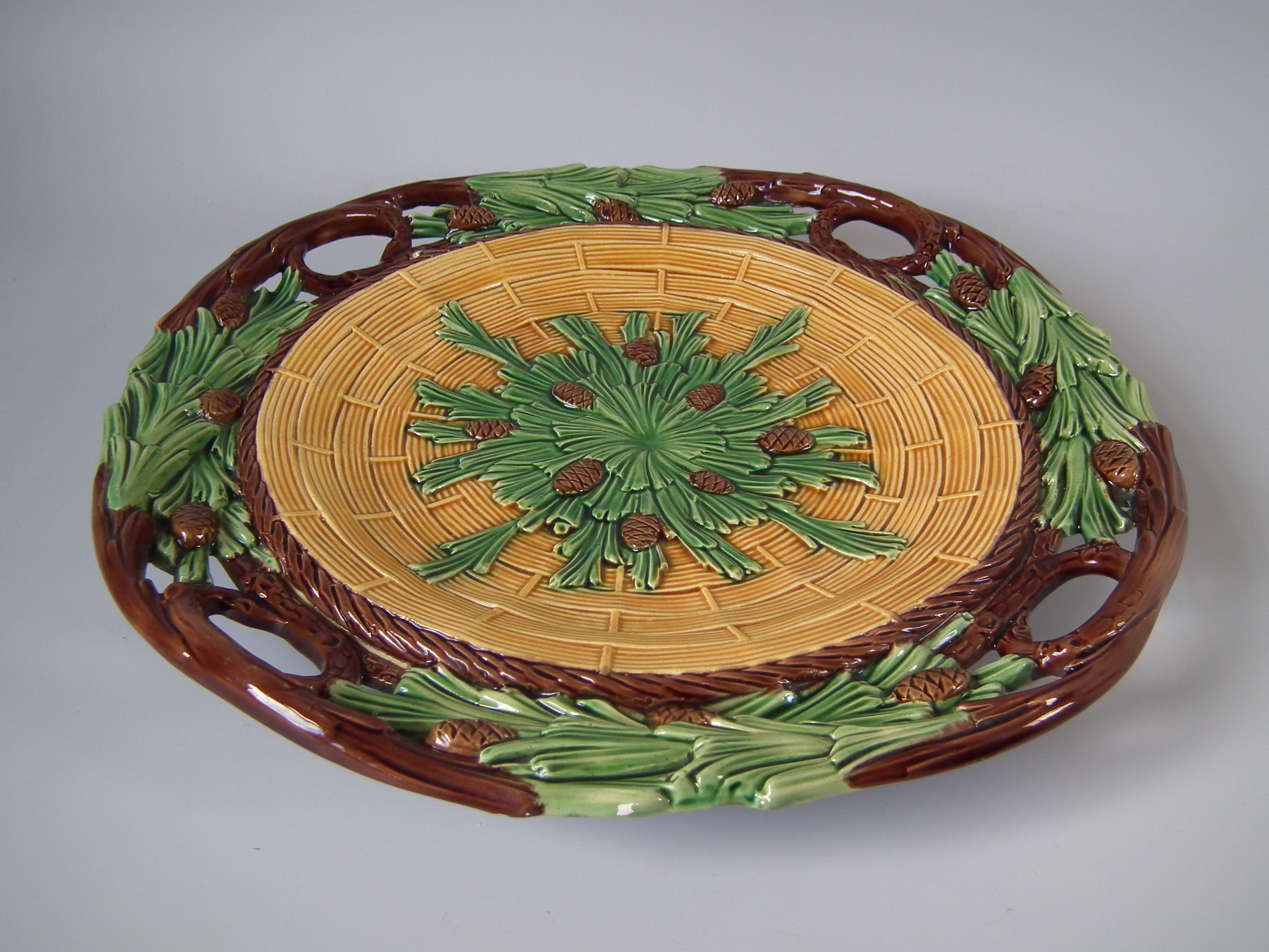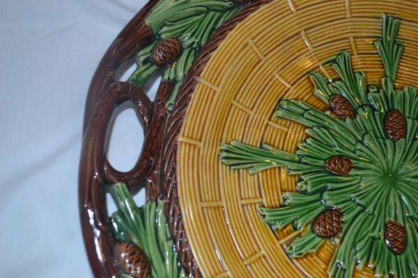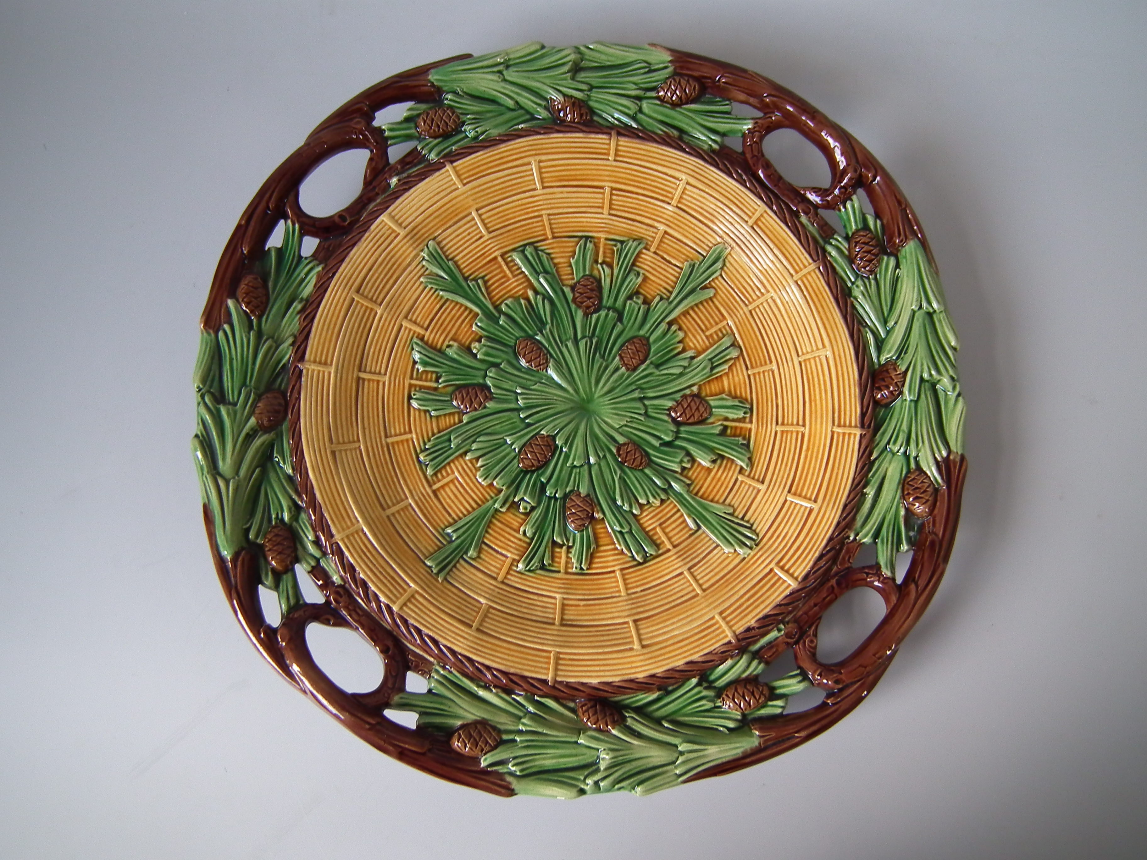 Victorian, circa 1859. 13.8ins high, 13.8ins wide, 1.8ins depth. Minton Majolica platter which features pine cones and needles.