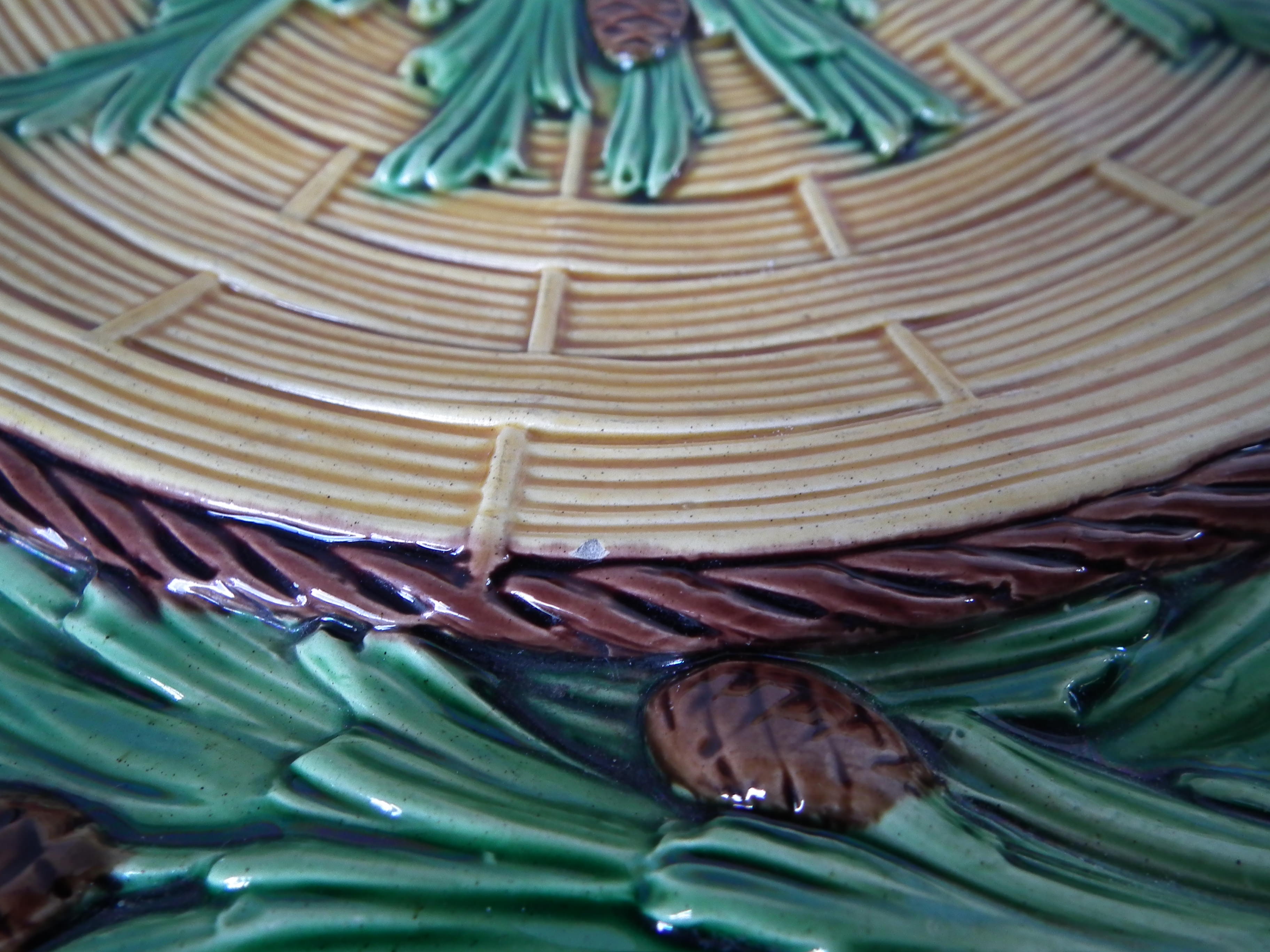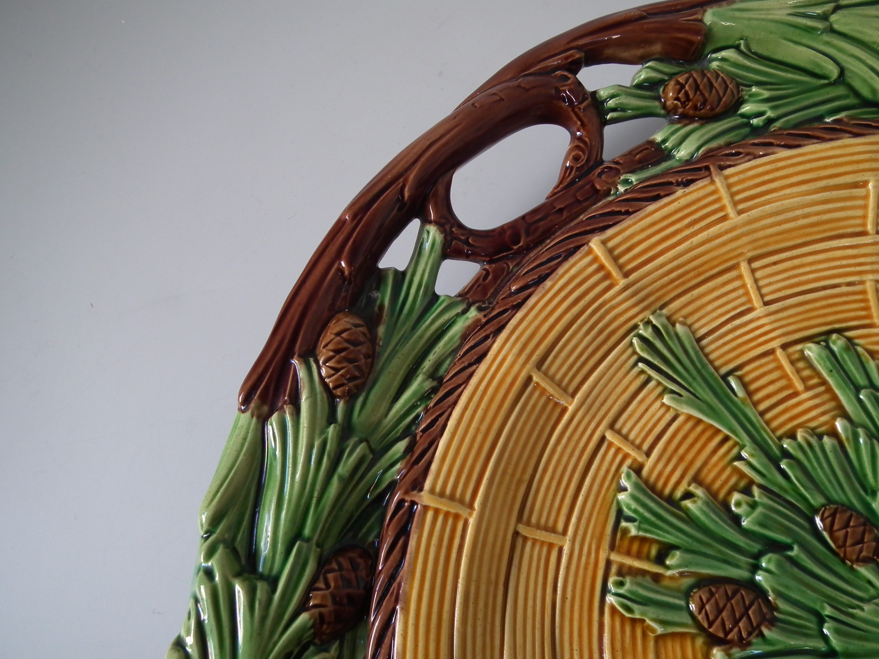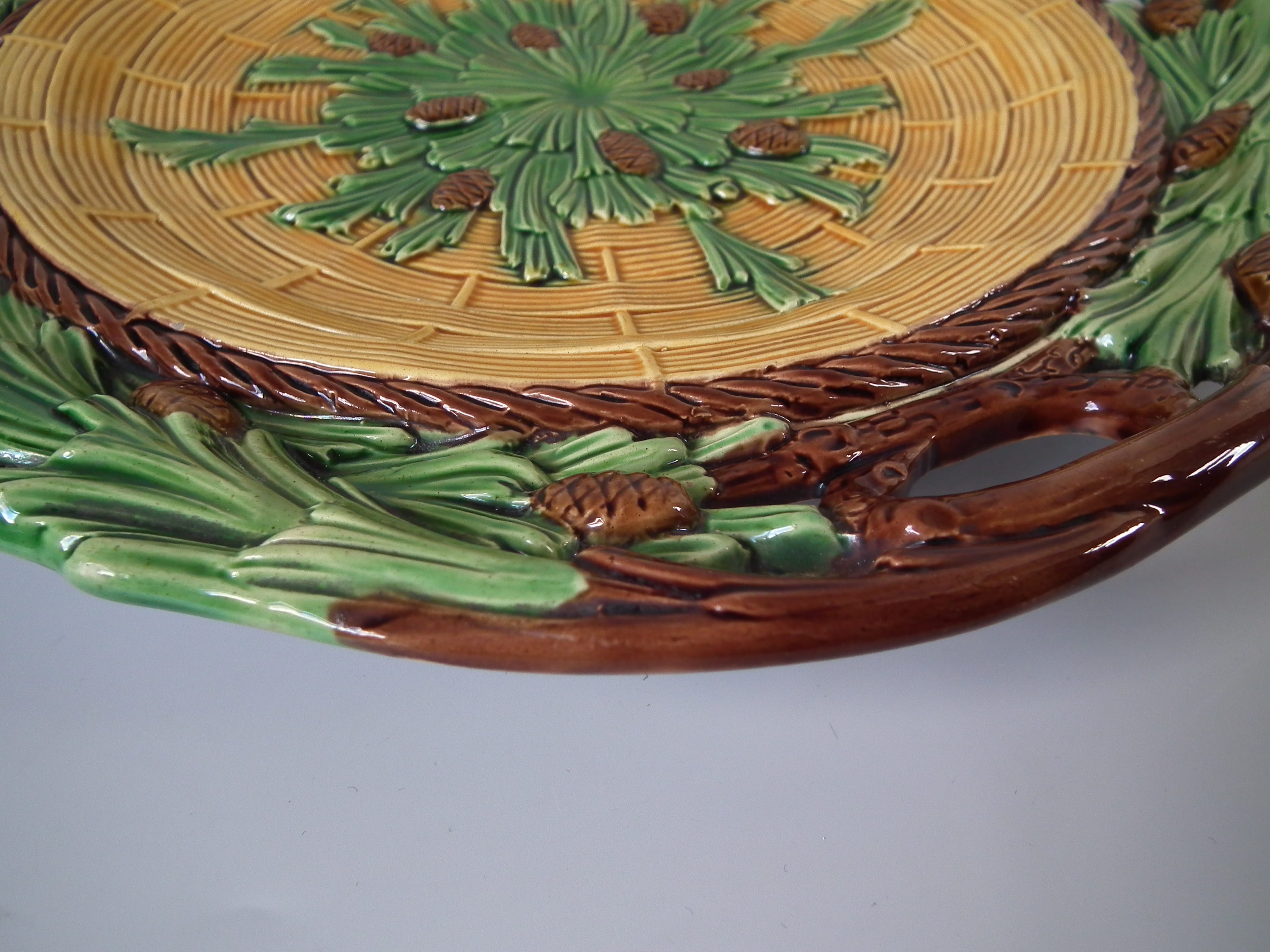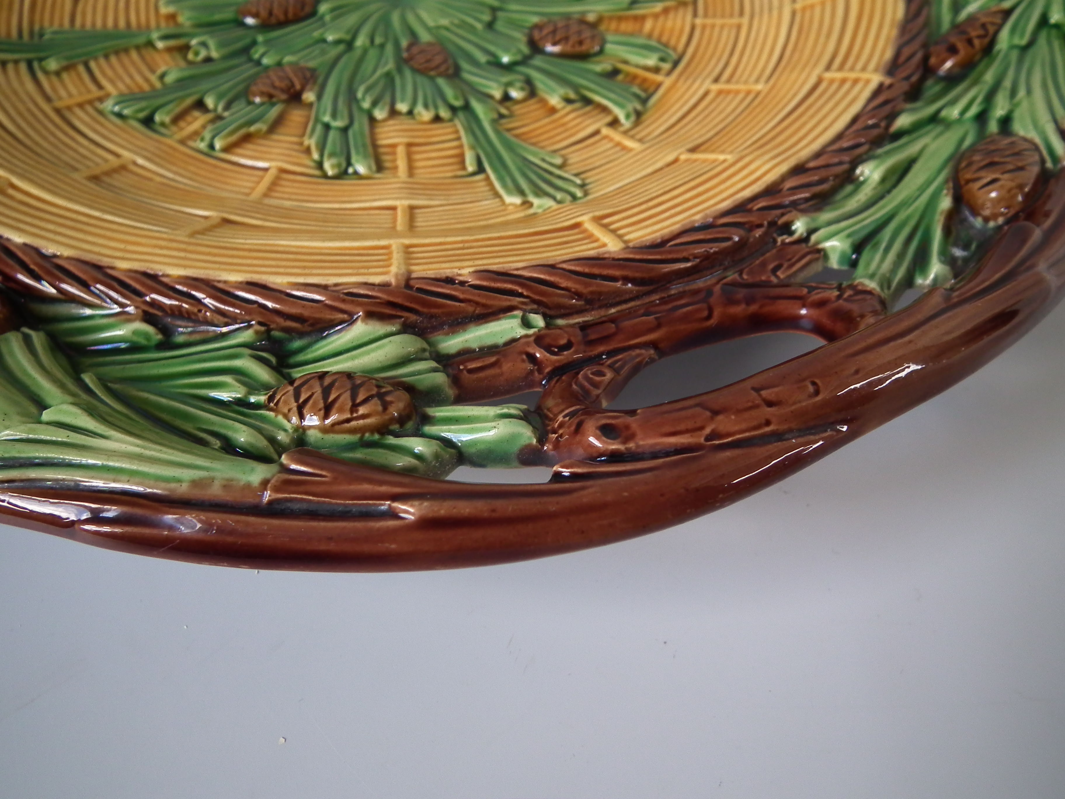 Victorian, circa 1859. 13.8ins high, 13.8ins wide, 1.8ins depth. Minton Majolica platter which features pine cones and needles.