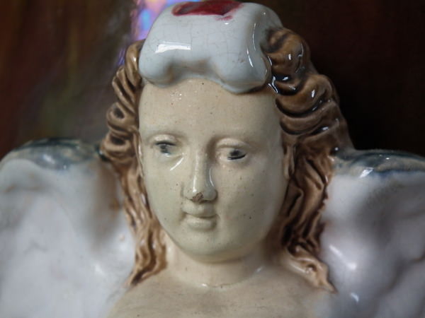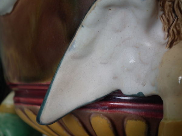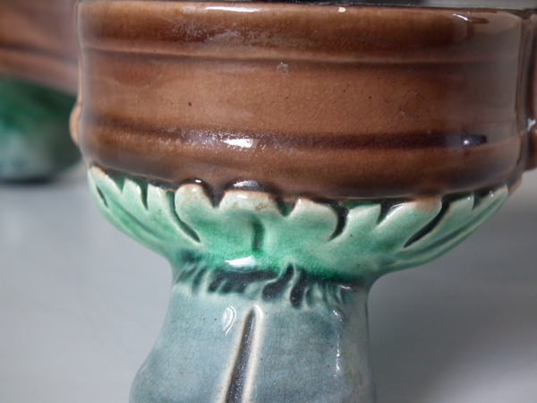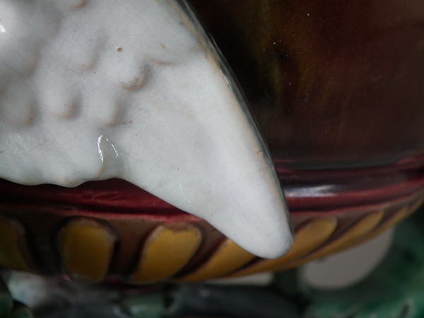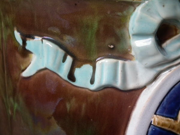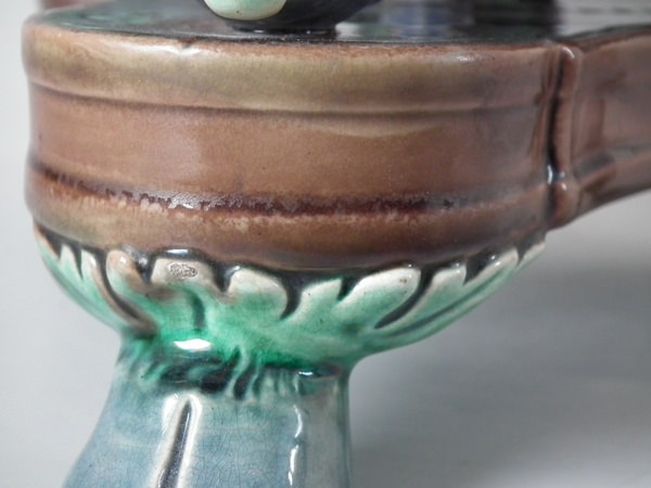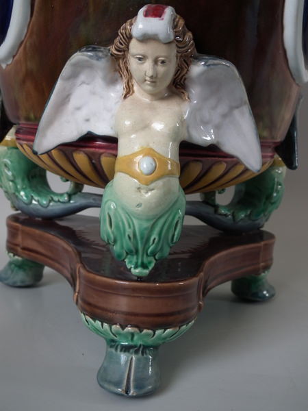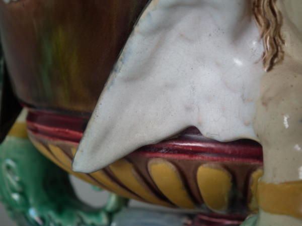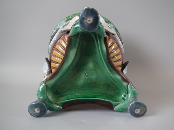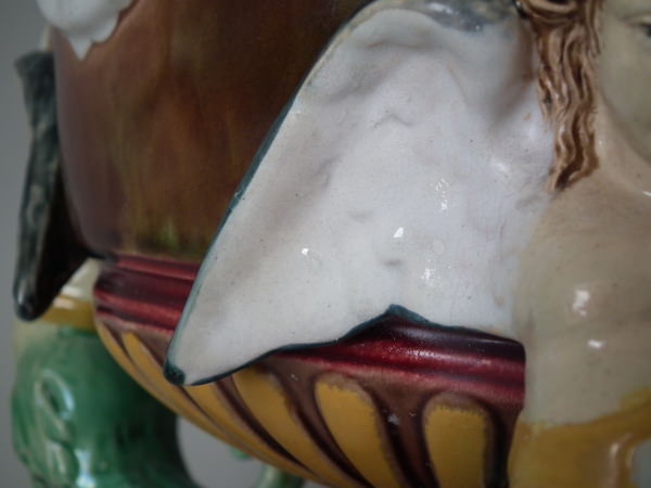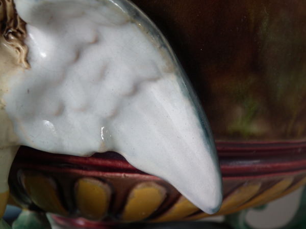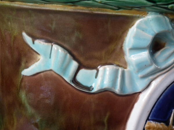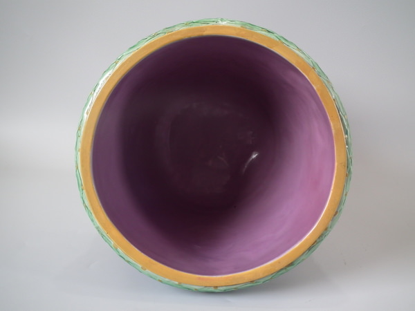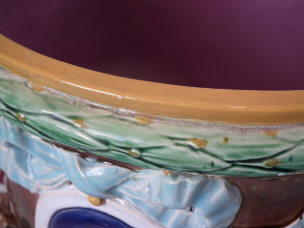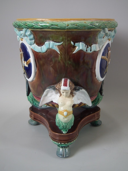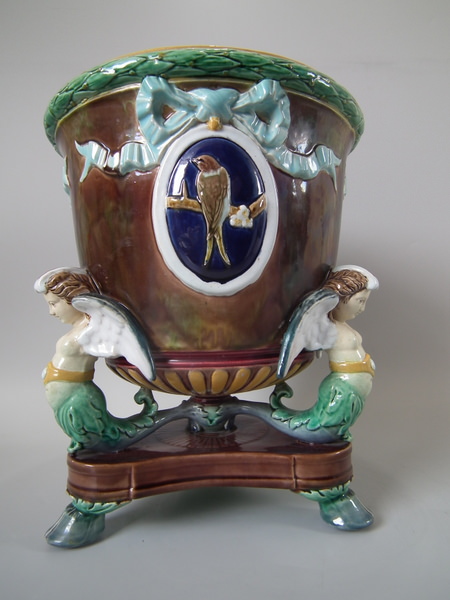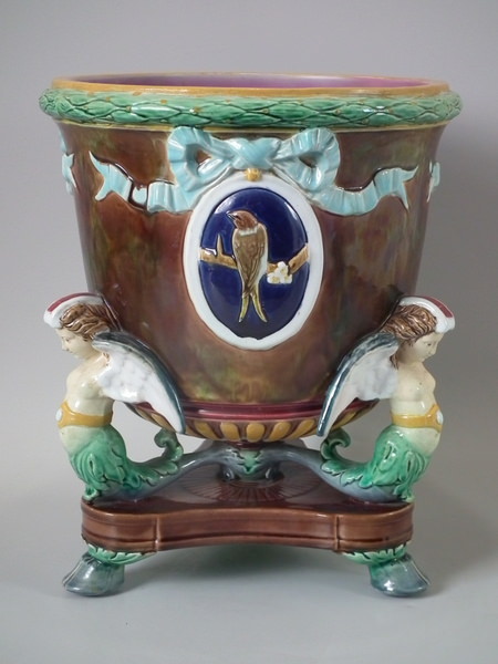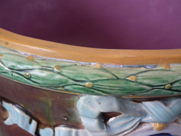 Victorian, circa 1870. 12.2ins high, 9.1ins wide, 9.1ins depth. Holdcroft Majolica jardinière which features