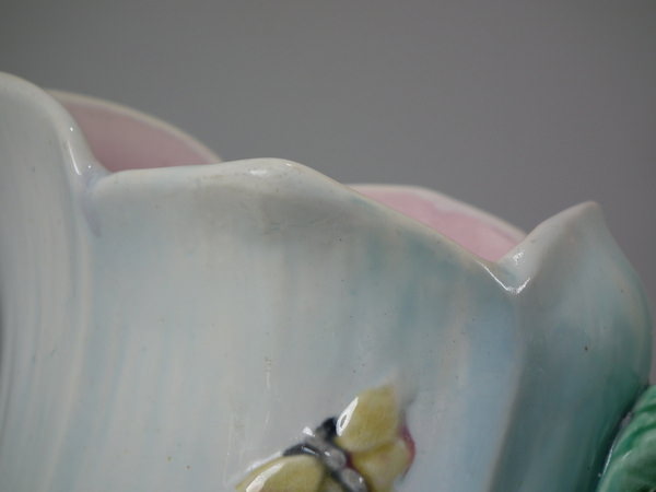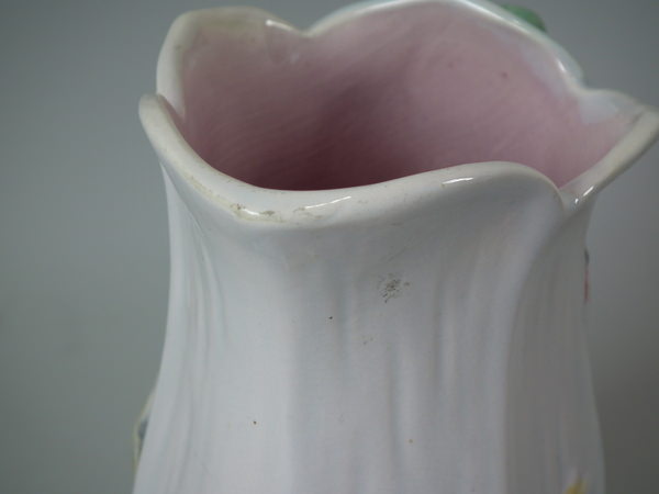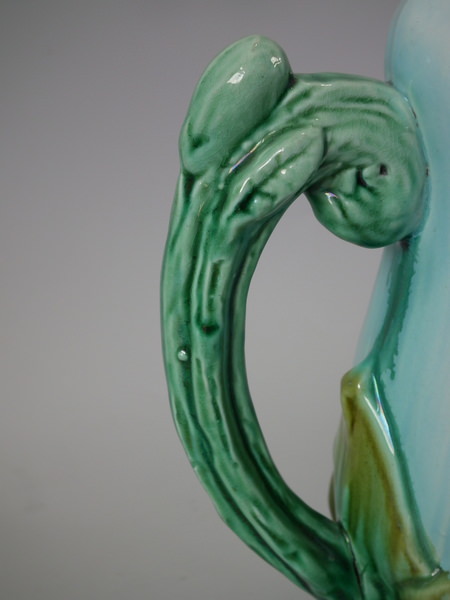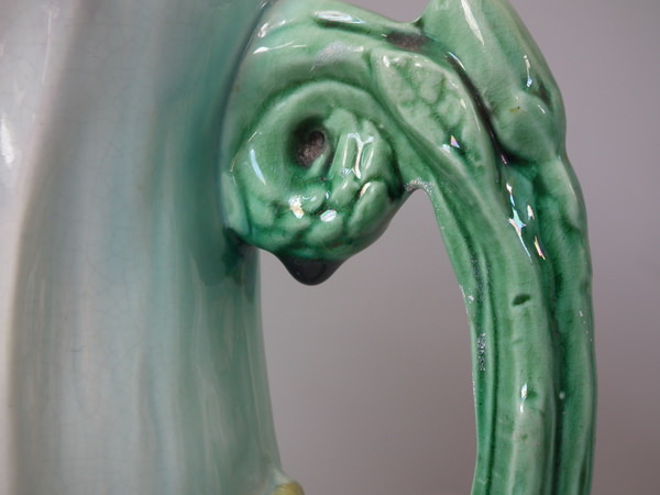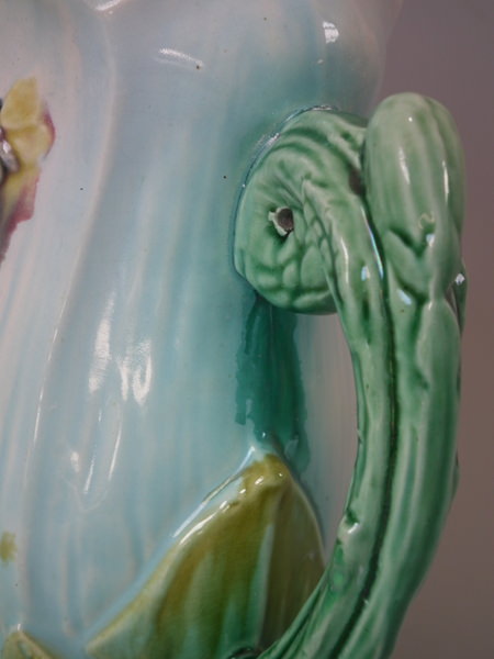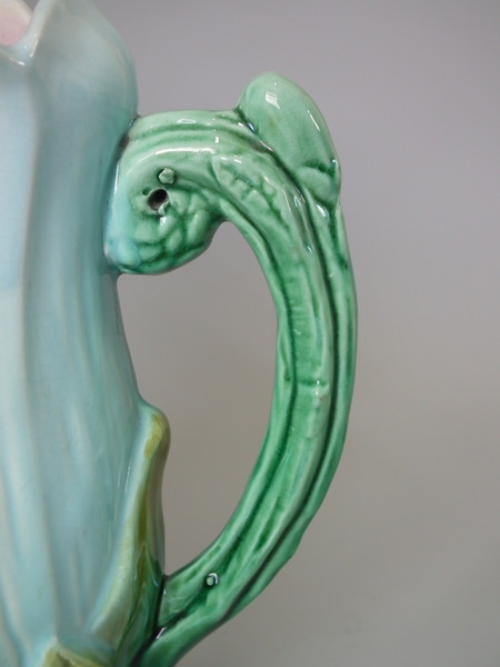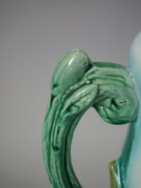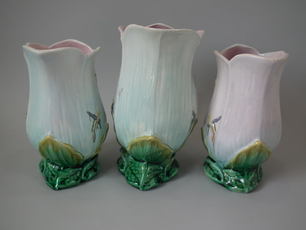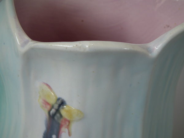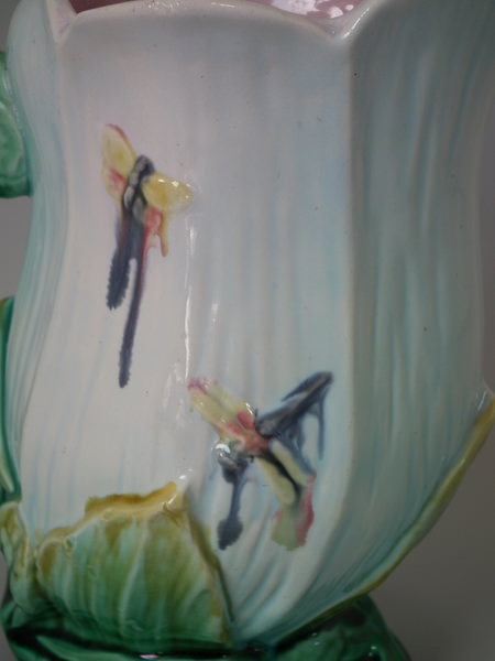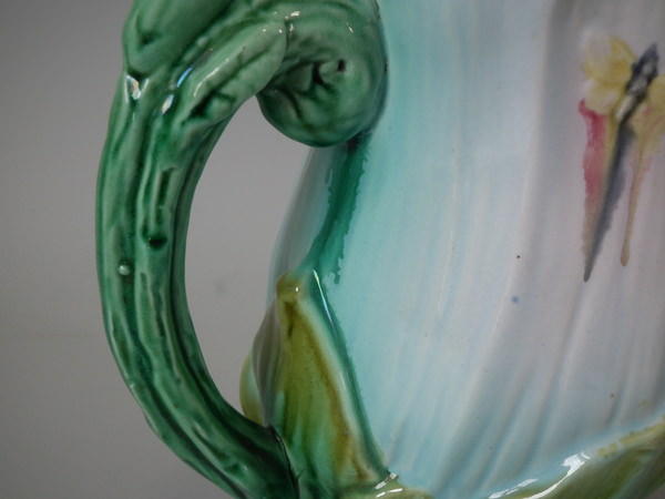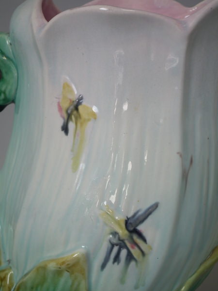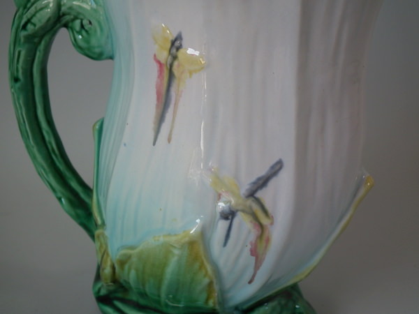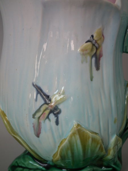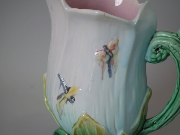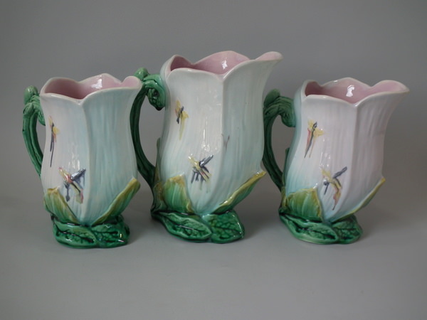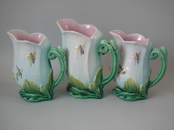 Set of three Majolica jug/pitchers which feature dragonflies and butterflies.