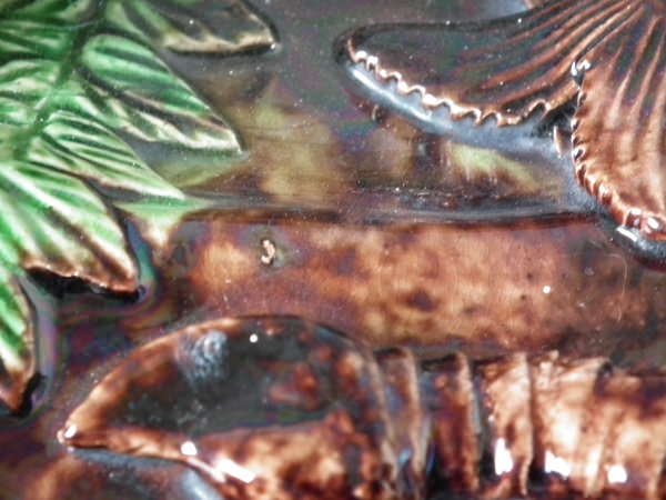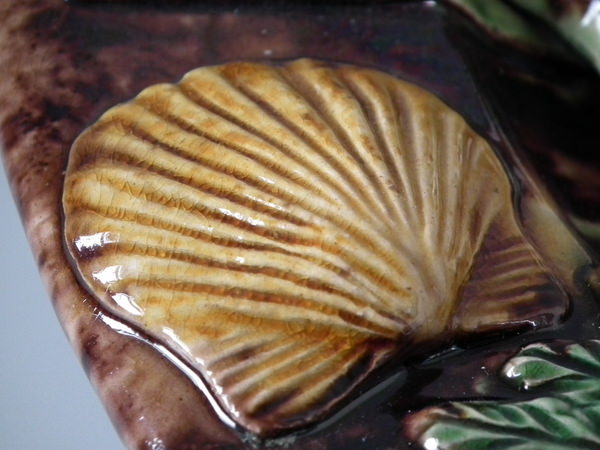 Victorian, circa 1890. 15.2ins high, 15.2ins wide, 2ins depth. Caldas Da Rainha Majolica wall charger which features fishes, an eel, shells and seaweed. Colouration: are predominant.