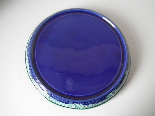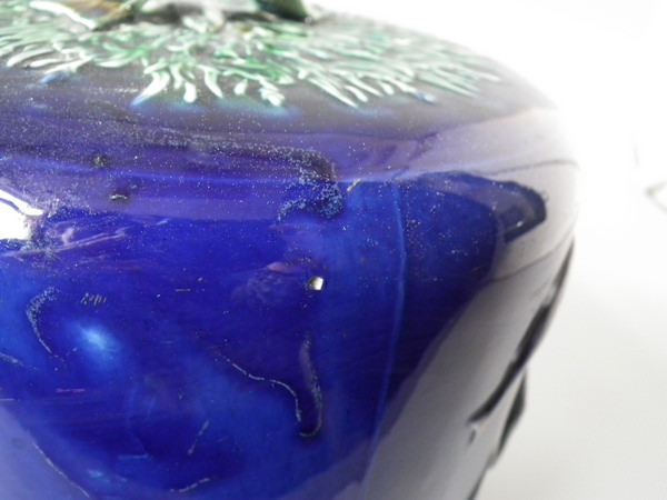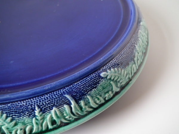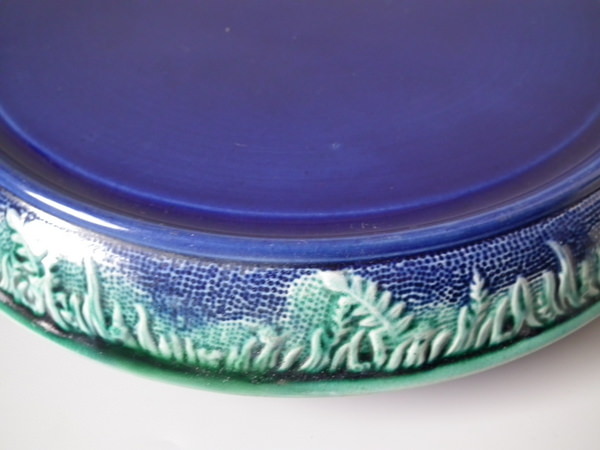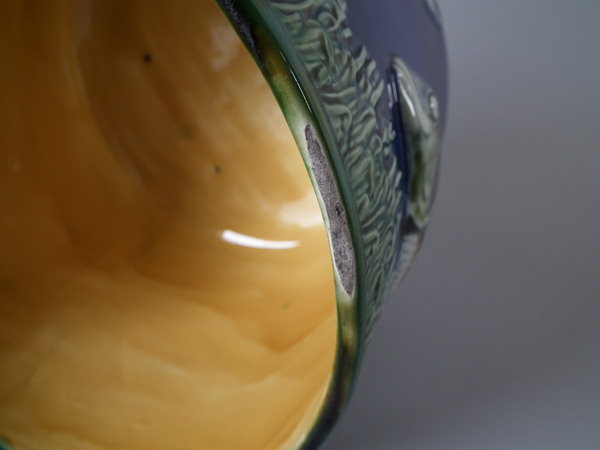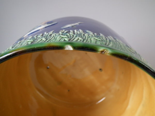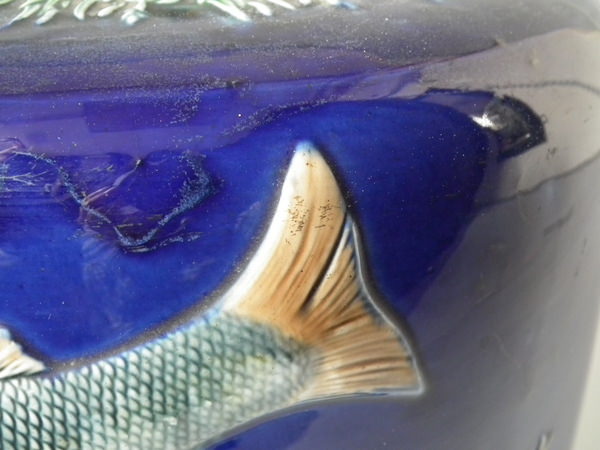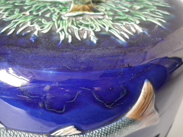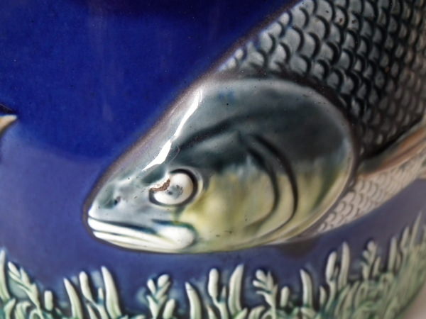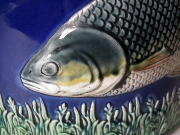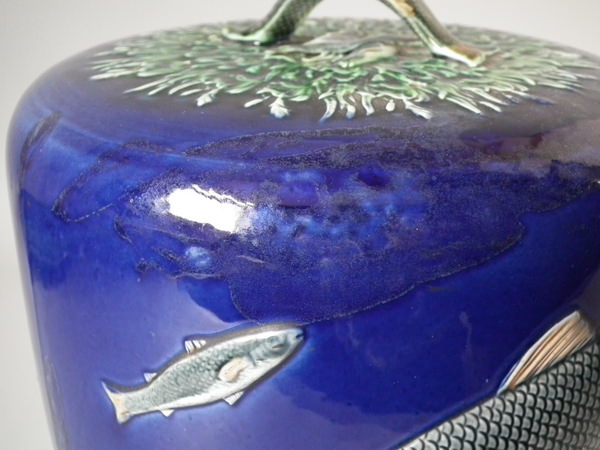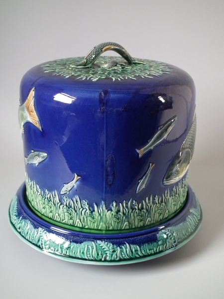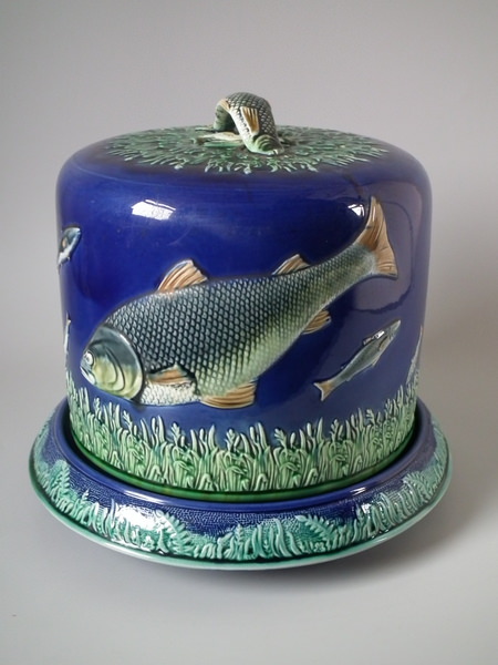 Victorian, circa 1870. 10.6ins high, 11.6ins wide, 11.6ins depth. Holdcroft Majolica cheese keep which features a fish handle with fish and foliage decoration to the sides.