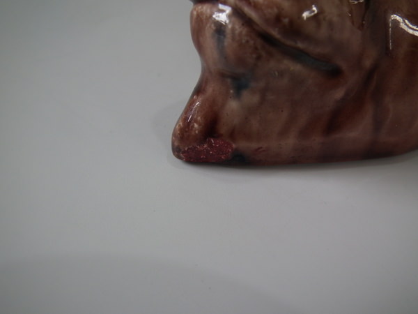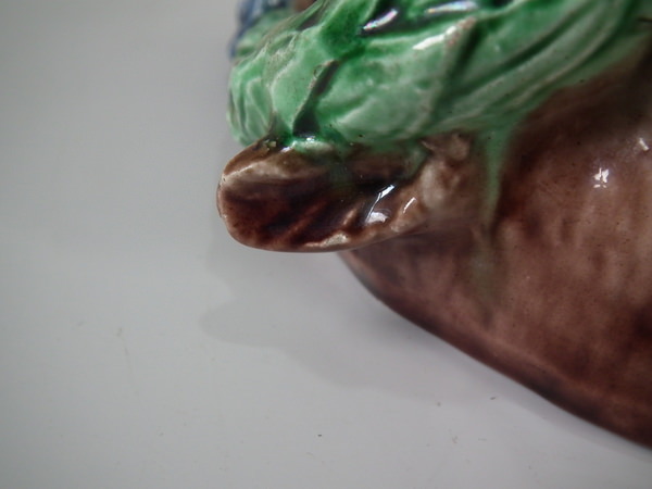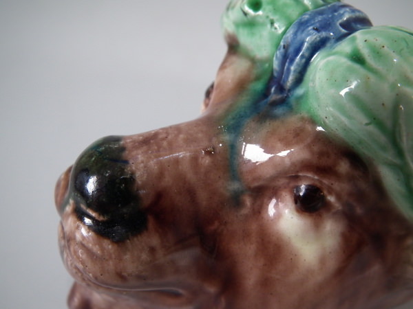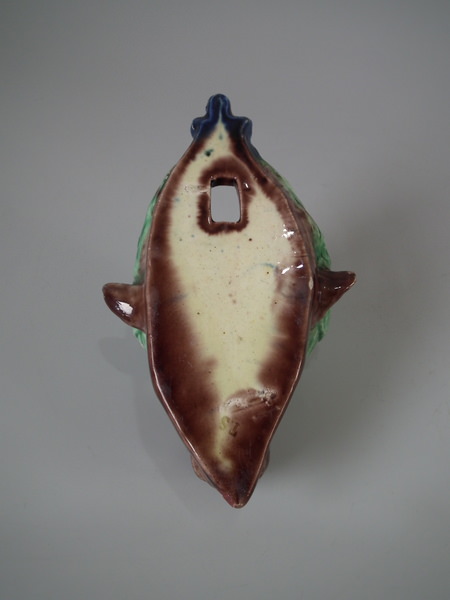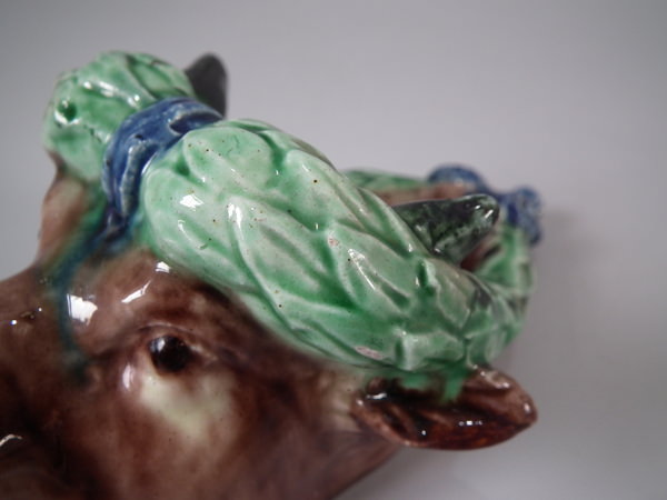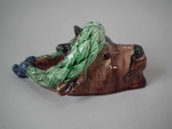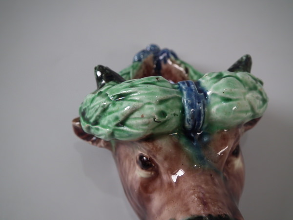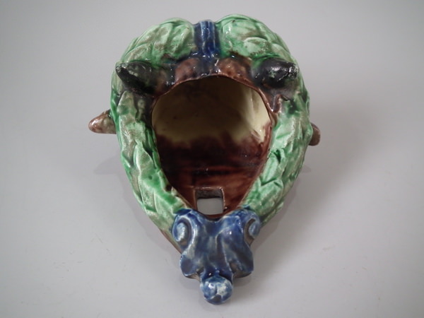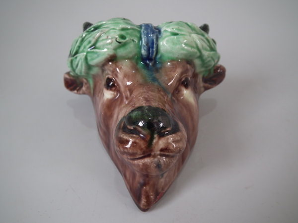 Victorian, circa 1870. 2.6ins high, 3.7ins wide, 5.7ins depth. Thomas Sergent Palissy Majolica wall pocket which features a bull's head. Colouration: brown, green, blue, are predominant.