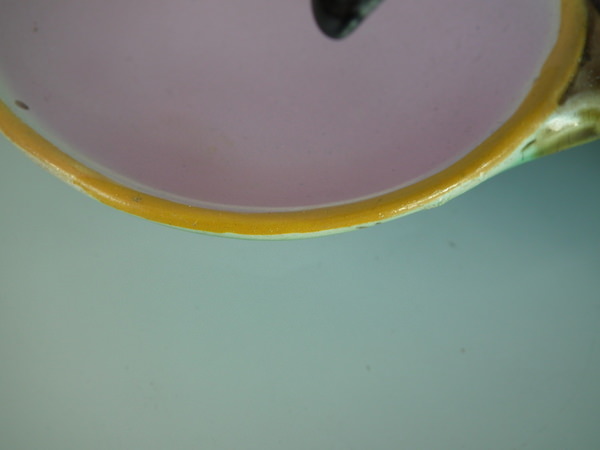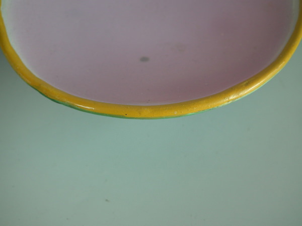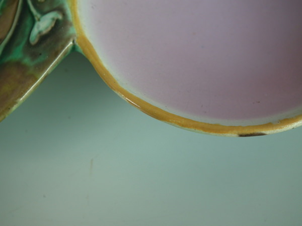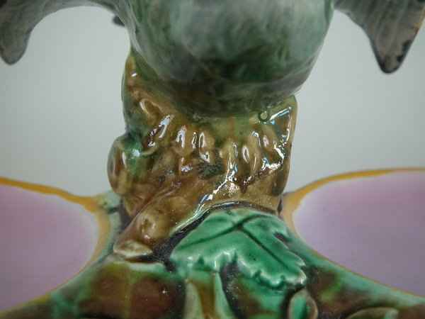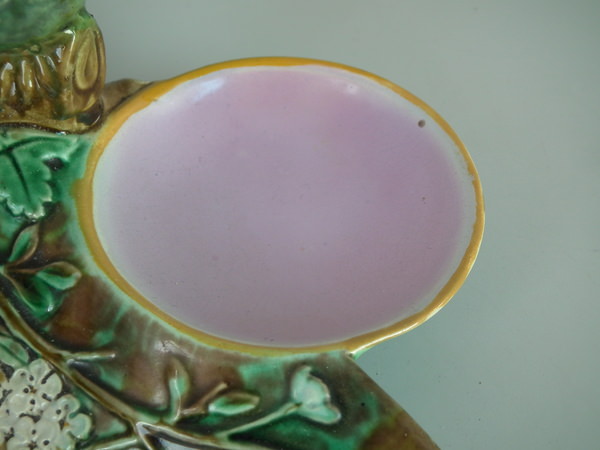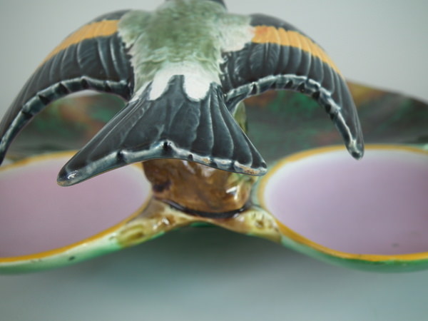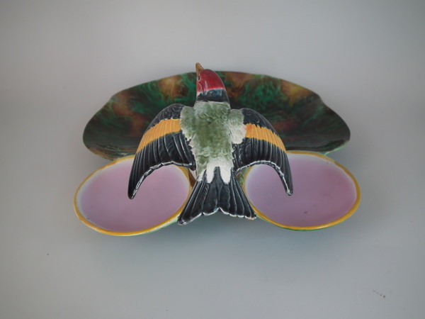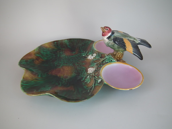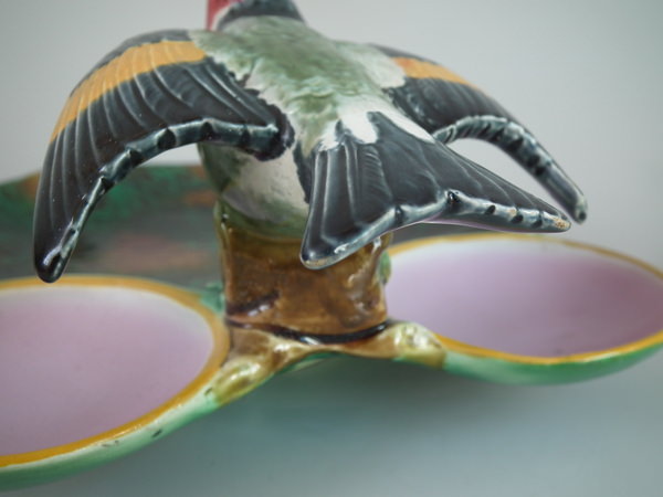 Victorian, circa 1872. 4.4ins high, 9.6ins wide, 11.4ins depth. Holdcroft Majolica strawberry server which features a bird (goldfinch) perched on the rim between wells. Mottled ground version.