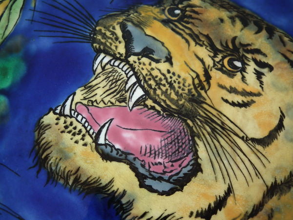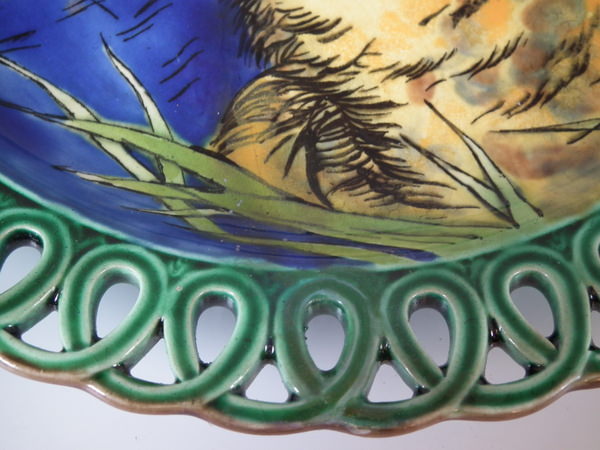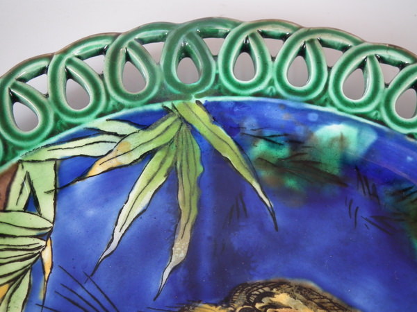 Victorian, circa 1874. 9.3ins high, 9.3ins wide, 0.8ins depth. Wedgwood Majolica plate which features a tiger.