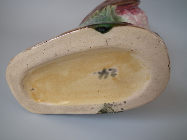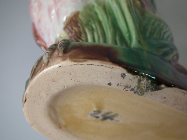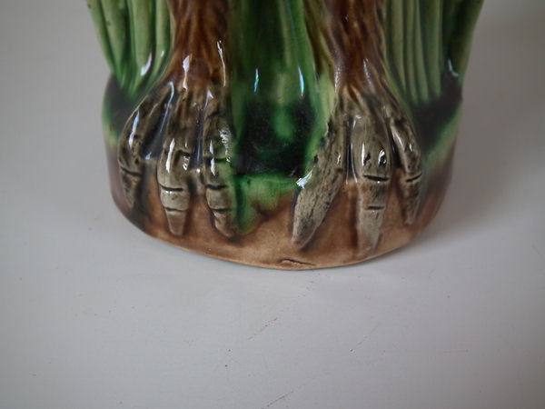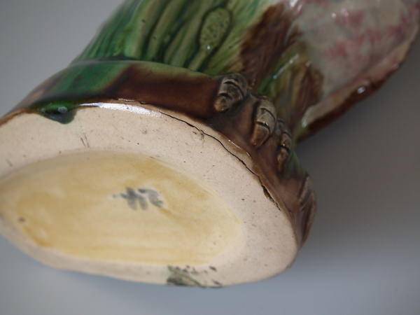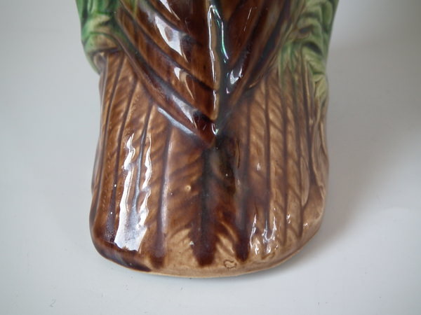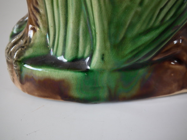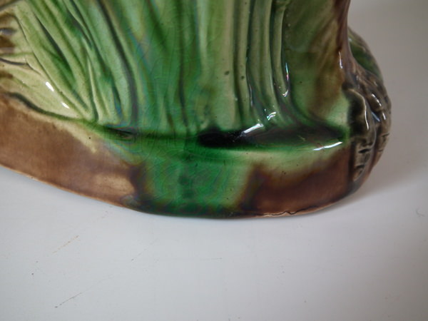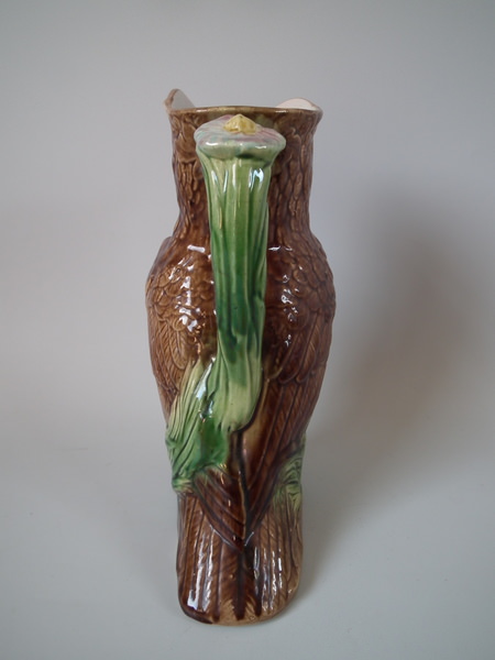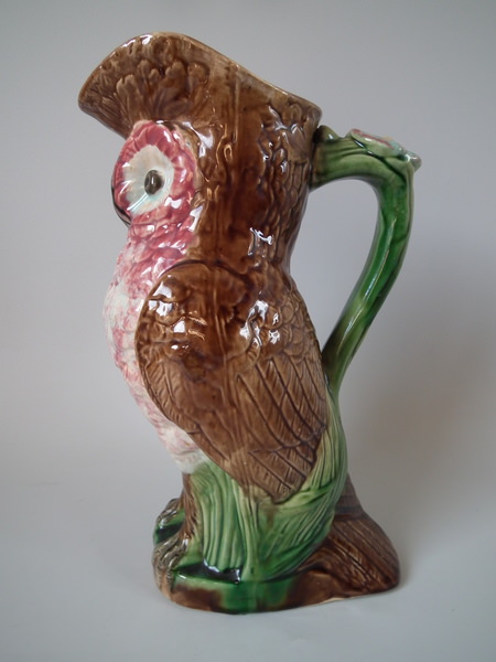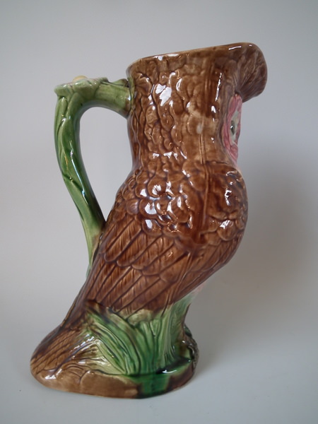 Victorian, circa 1880. 9.8ins high, 6.5ins wide, 4.3ins depth. Majolica jug/pitcher which features an owl resting amongst some bulrushes.