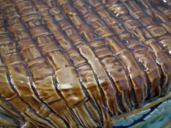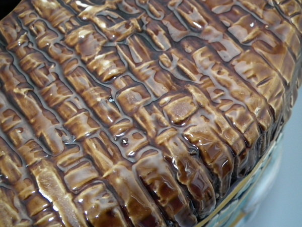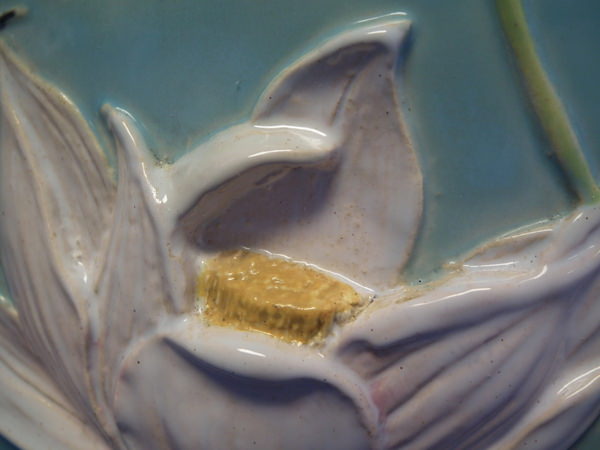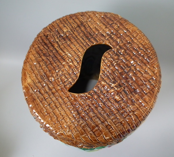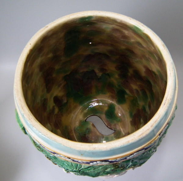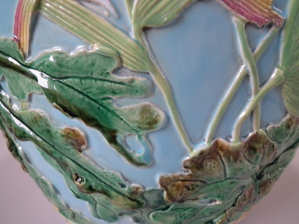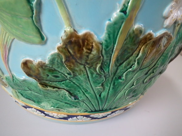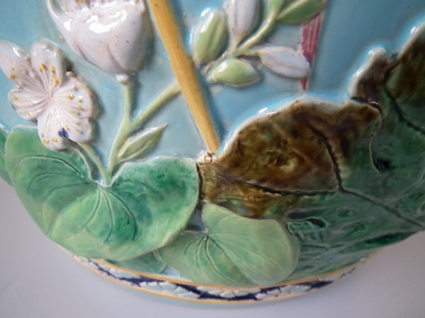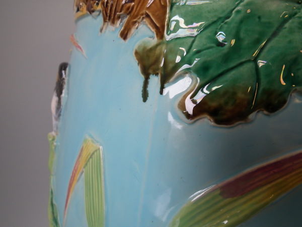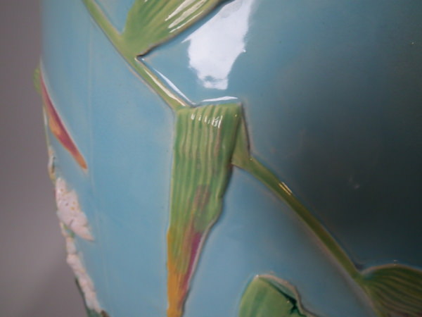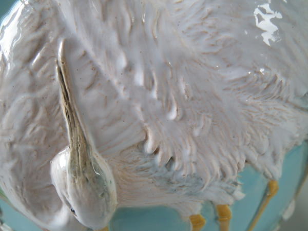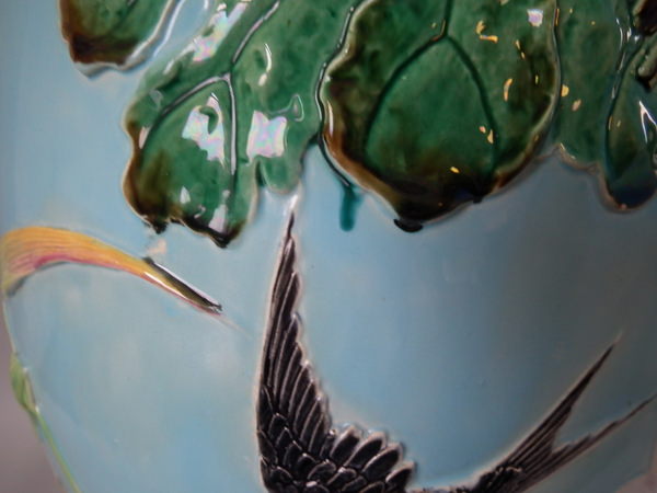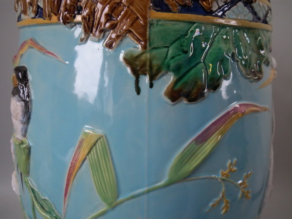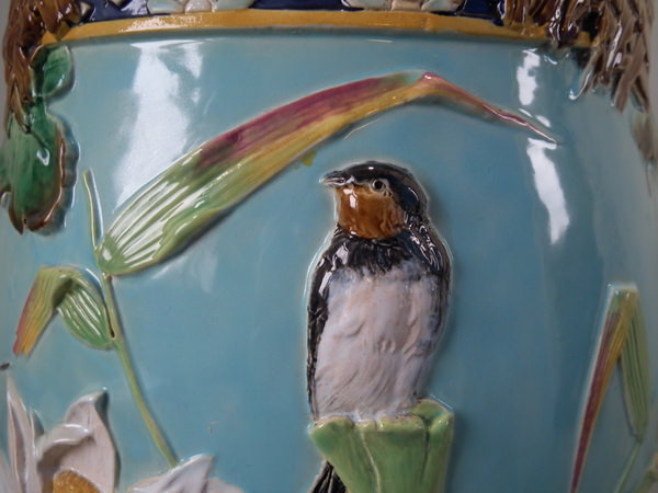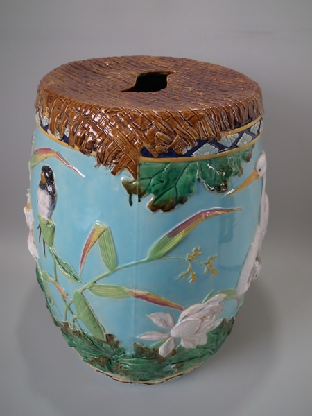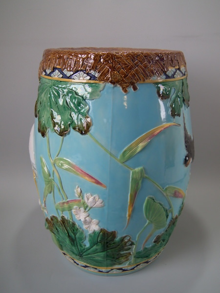 Victorian, circa 1875. 18.9ins high, 11.8ins wide, 11.8ins depth. George Jones Majolica garden seat which features storks, swallows and lilies. Turquoise ground version.