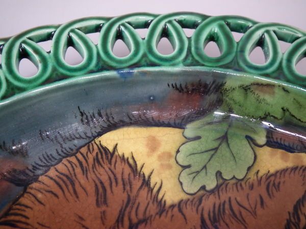 Victorian, circa 1879. 9.2ins high, 9.2ins wide, 0.9ins depth. Wedgwood Majolica plate which features a fox. Colouration: green, brown, ochre, are predominant.