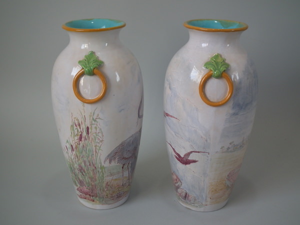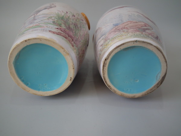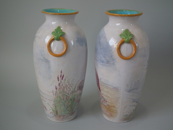 Pair Minton Majolica hand painted, signed, pictorial vases