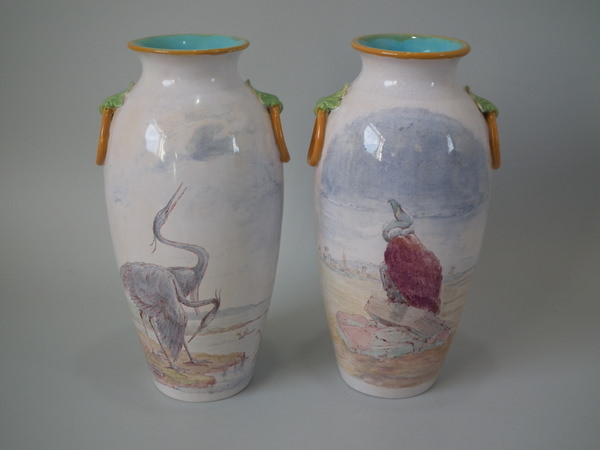 Victorian, circa 1869. Tallest is 8.5ins high, 3.9ins wide, 3.5ins depth. Pair of Minton Majolica vases which feature hand painted scenes, featuring birds. (Vultures, Herons, Cranes). Signed, 'Nina 1869'.