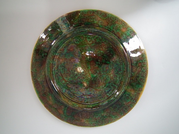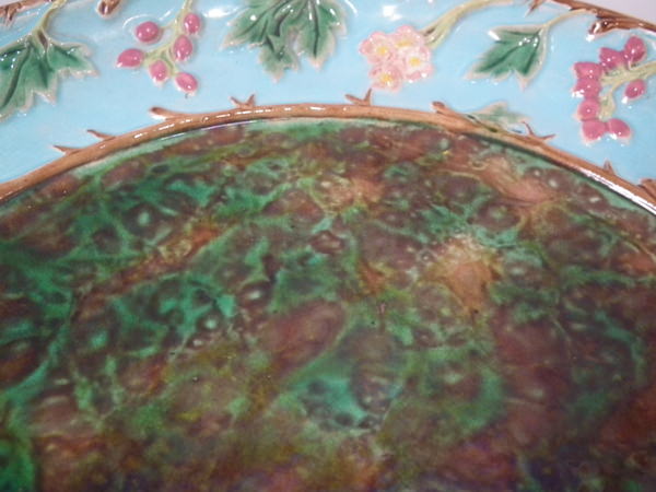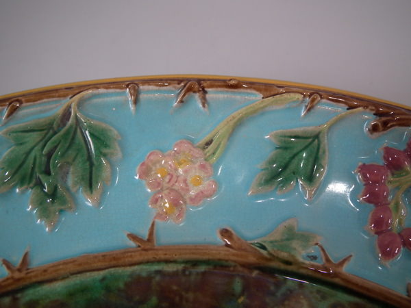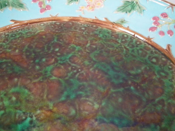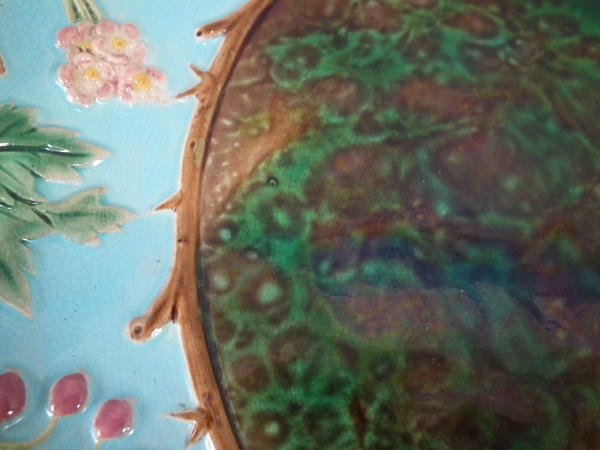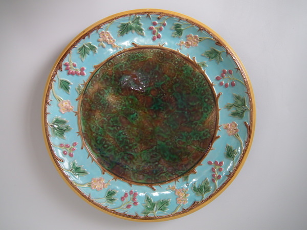 Victorian, circa 1870. 12.8ins high, 12.8ins wide, 1.8ins depth. George Jones Majolica platter which features mottled green and brown centre, surrounded by hawthorn berries and blossom border.