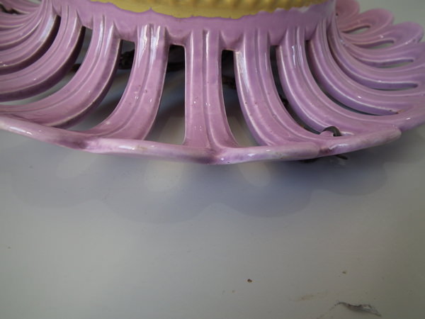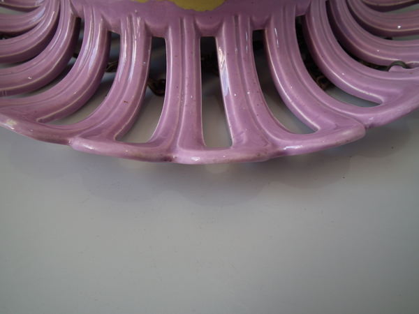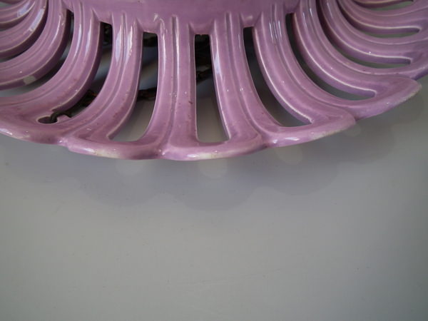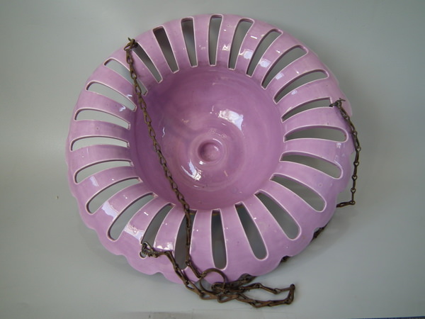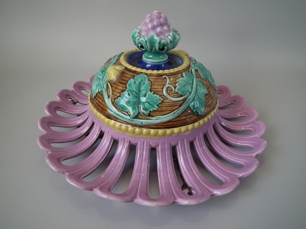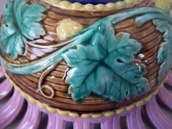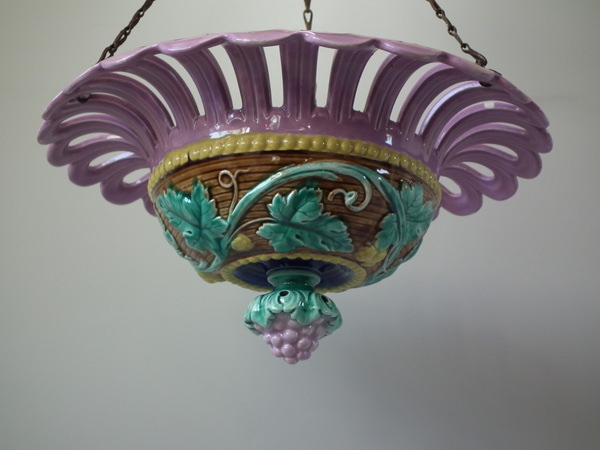 Victorian, circa 1880. 6.5ins high, 13.8ins wide, 13.8ins depth. Majolica hanging basket which features trailing vine leaves, with a bunch of grapes forming the finial to the base.