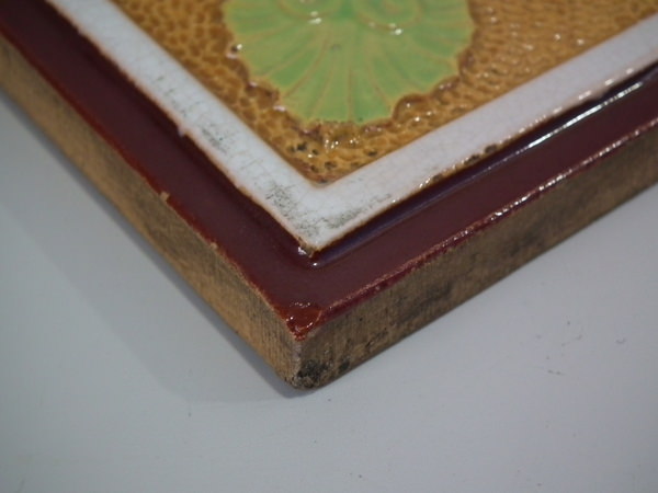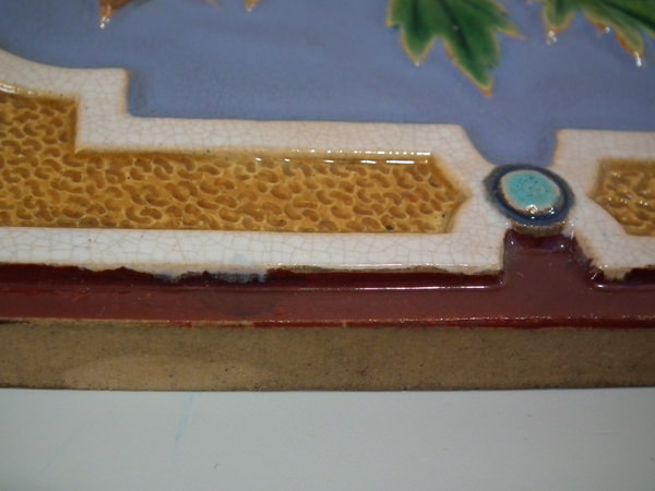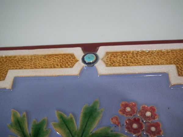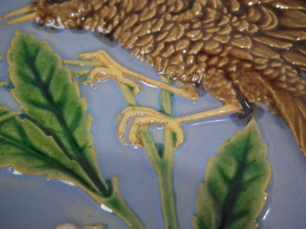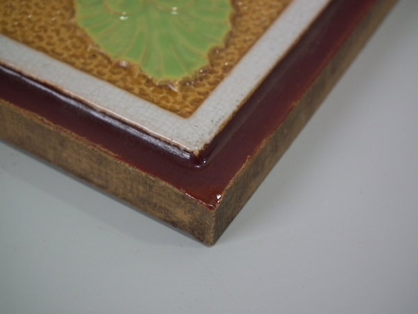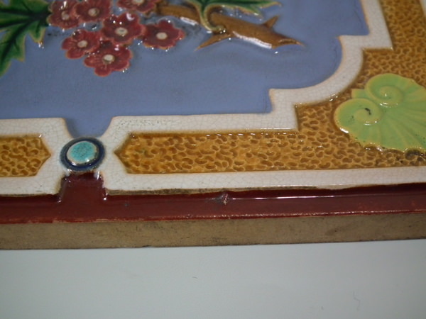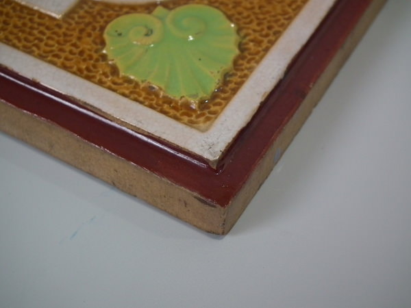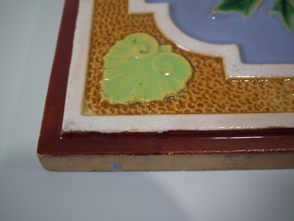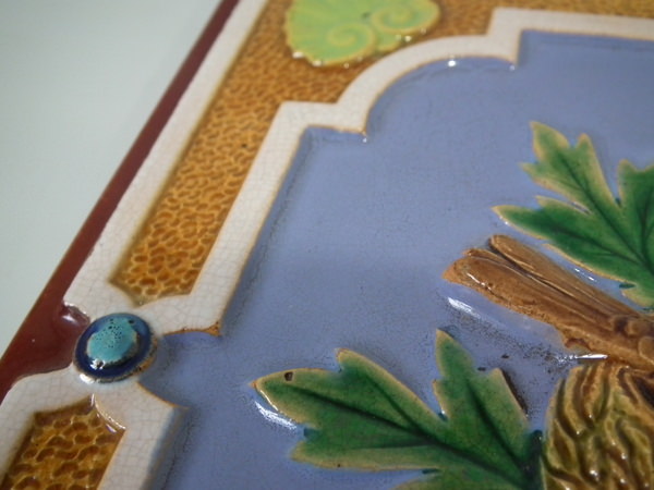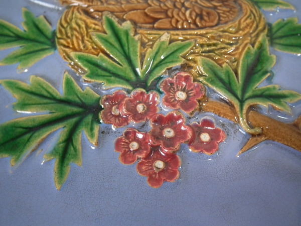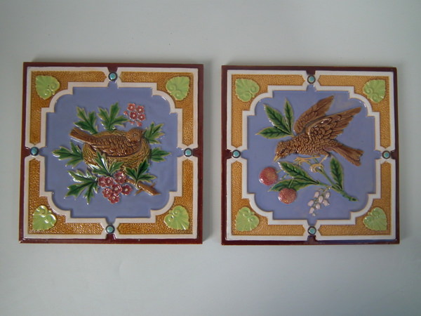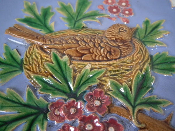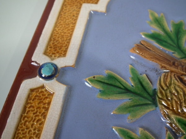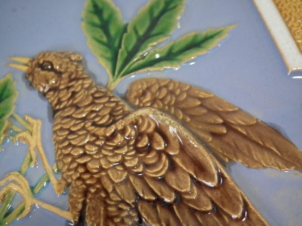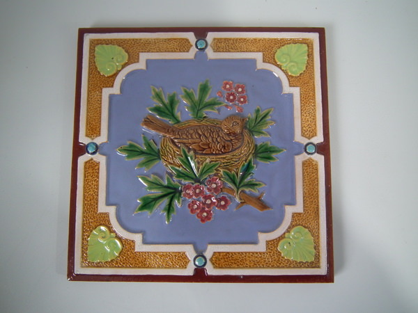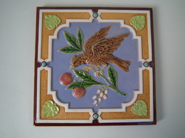 Victorian, circa 1870. 7.8ins high, 7.8ins wide, 0.5ins depth. Minton Hollins & Co. Majolica tile which features a bird perched on a fruiting branch and a bird in it's nest.
