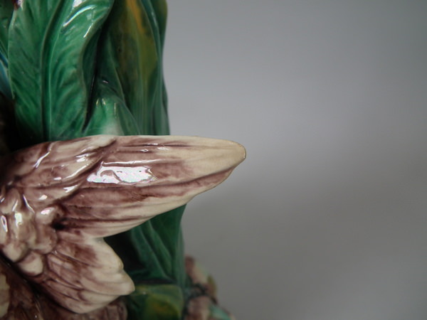 Victorian, circa 1880. 6.7ins high, 5.5ins wide, 4.3ins depth. Royal Worcester Majolica vase which features a bird looking up at some berries.