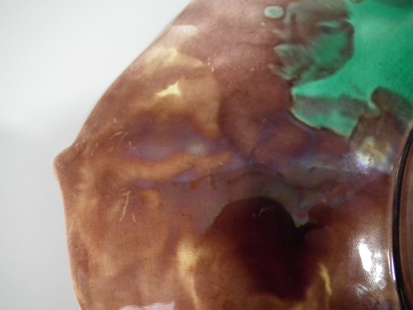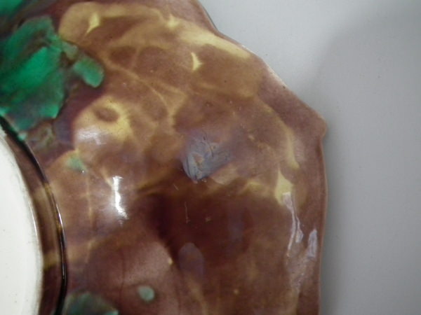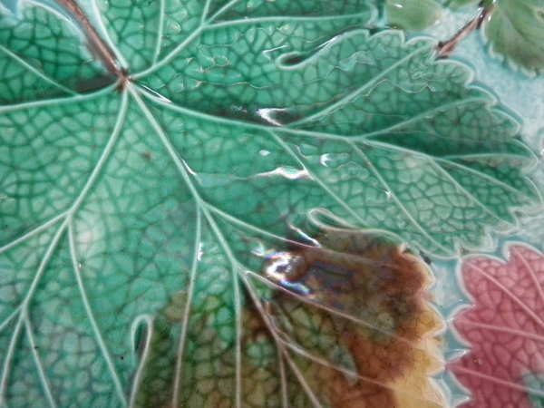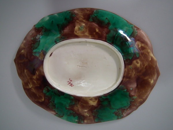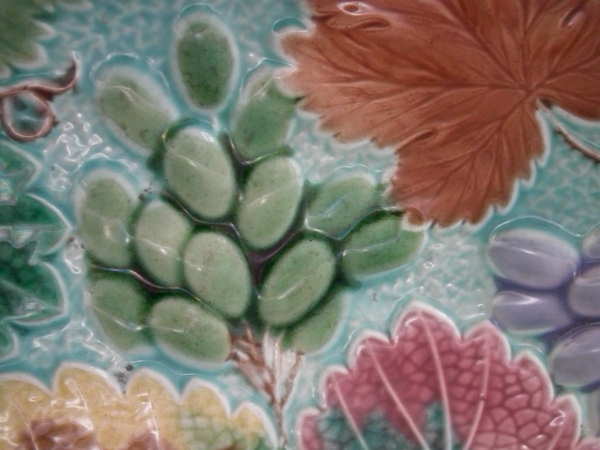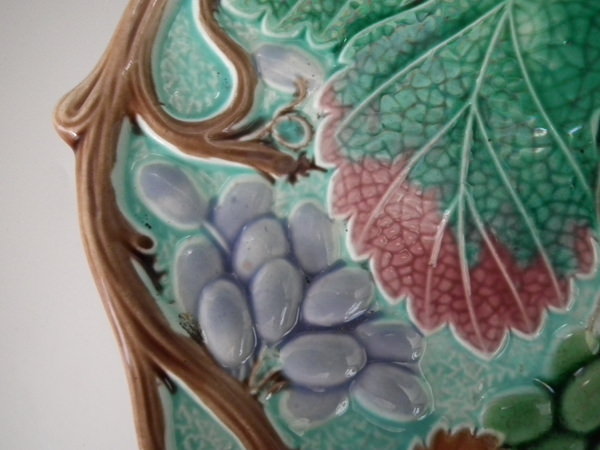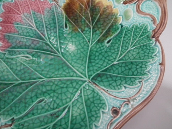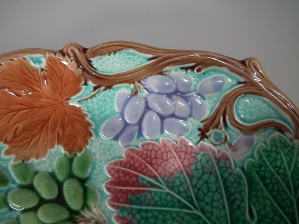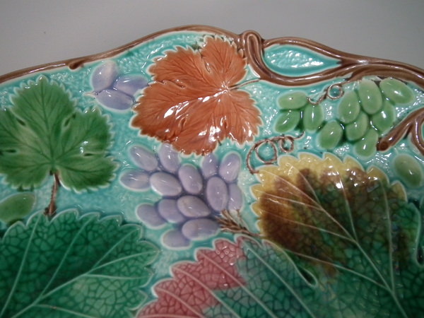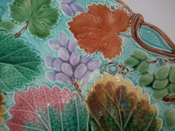 Victorian, circa 1880. 9.8ins high, 12.2ins wide, 1.8ins depth. Wedgwood Majolica platter which features grape vines and strawberry leaves, with twig rim. Turquoise ground version.