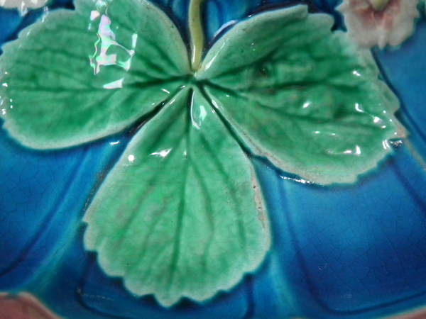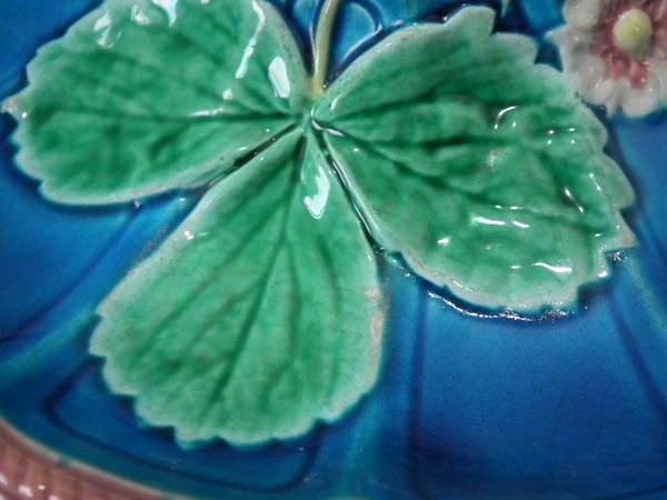 Victorian, circa 1880. 8.3ins high, 8.3ins wide, 1.4ins depth. Royal Worcester Majolica strawberry server which features strawberry leaves and flowers.