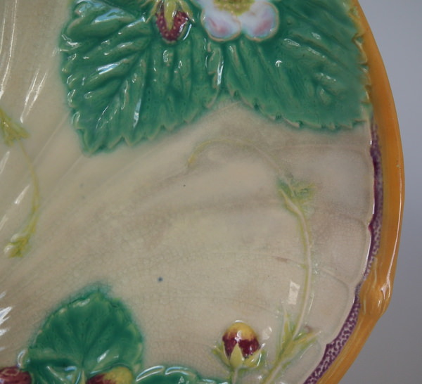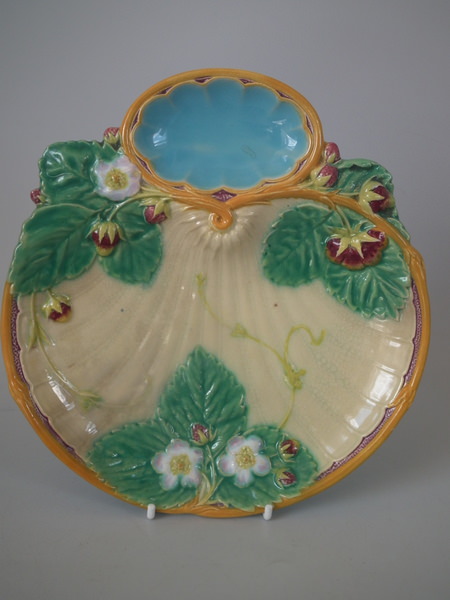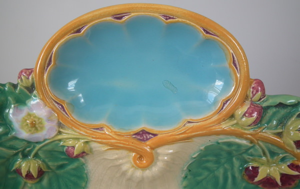 Victorian, circa 1868. 8.5ins high, 8.1ins wide, 0.9ins depth. Minton Majolica strawberry server which features strawberry fruits, leaves and flowers. Cream ground version. Colouration: green, ochre, turquoise, are predominant.