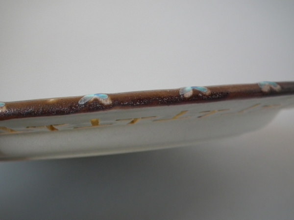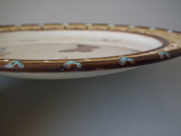 Victorian, circa 1875. 0.9ins high, 0.9ins wide, 0.7ins depth. Wedgwood Majolica plate which features butterflies, insects and blossom. Cream ground version. Colouration: cream, ochre, brown, are predominant.
