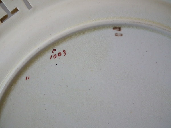 The piece bears maker's marks for the Wedgwood pottery. Bears a pattern number, '1003'. Marks include a factory specific date cipher for the year 1875.