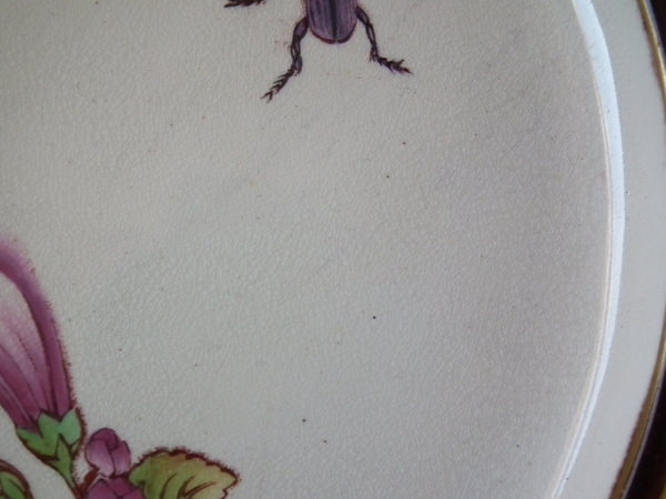 Victorian, circa 1874. 8.7ins high, 8.7ins wide, 0.7ins depth. Wedgwood Majolica plate which features a butterfly, beetle, blossom and leaves. Cream ground version. Colouration: cream, ochre, brown, are predominant.