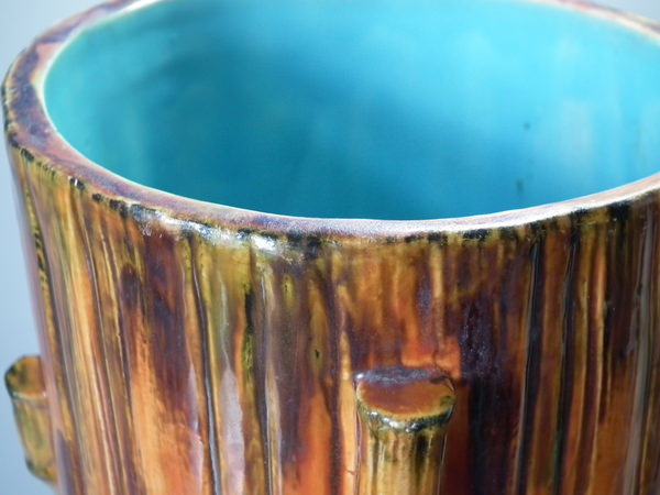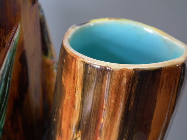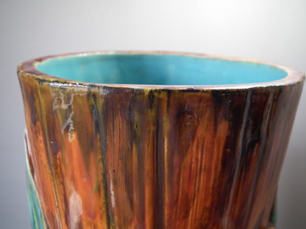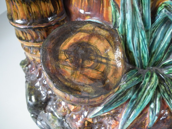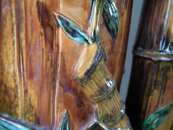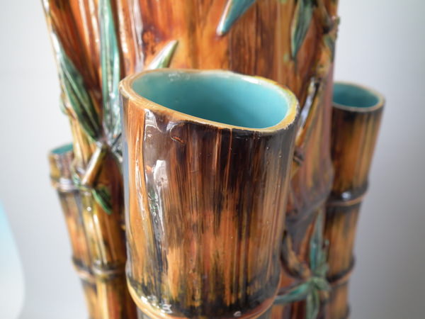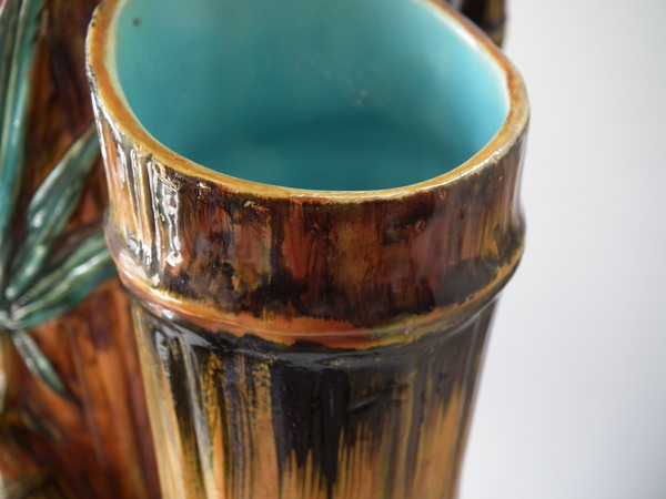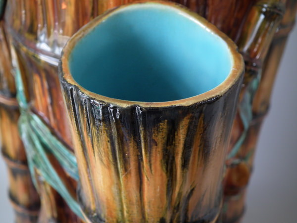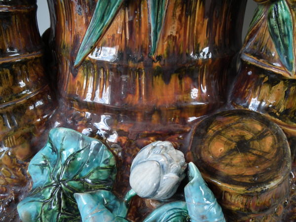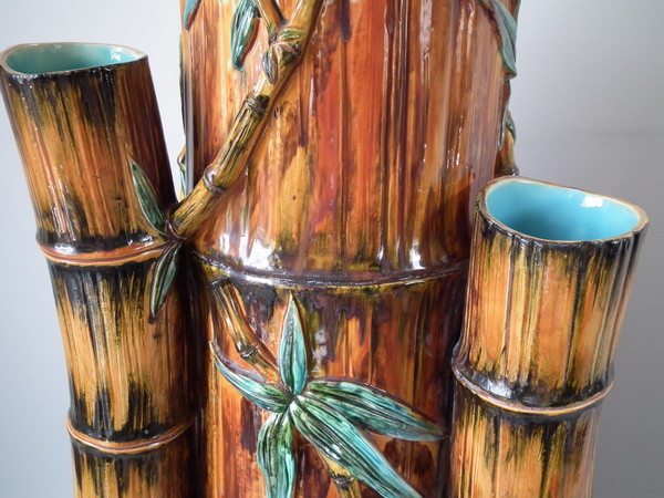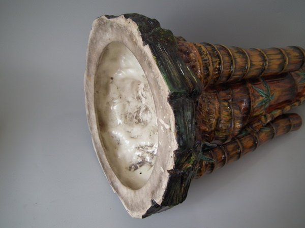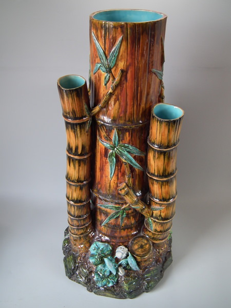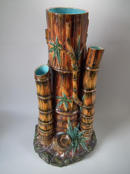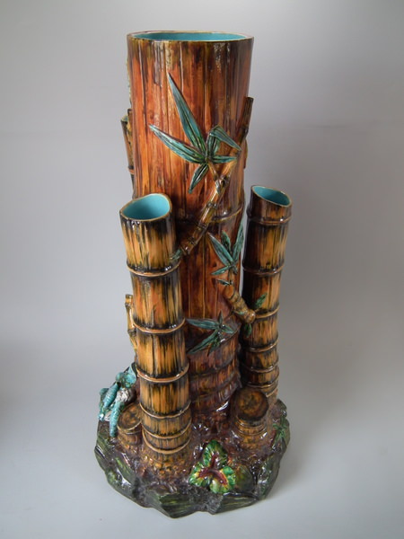 Victorian, circa 1880. 27.6ins high, 14.6ins wide, 14.2ins depth. Royal Worcester Majolica stick or umbrella stand which features bamboo canes and shoots and lillies to the ground.