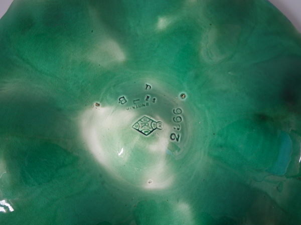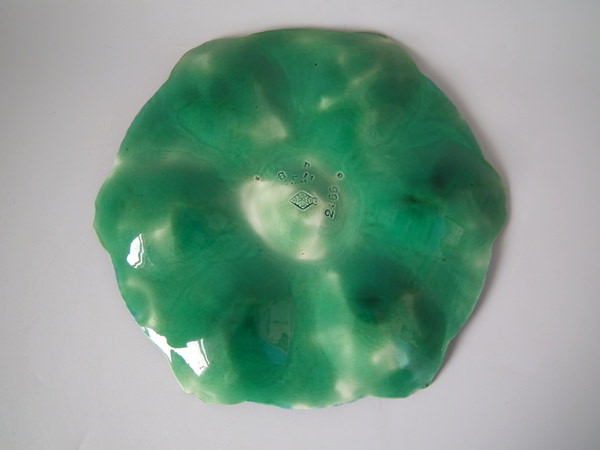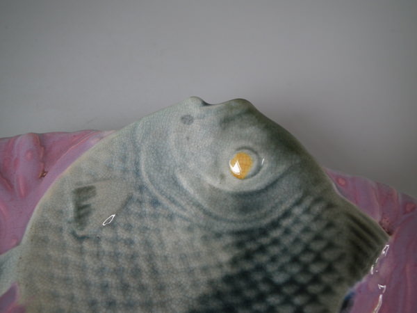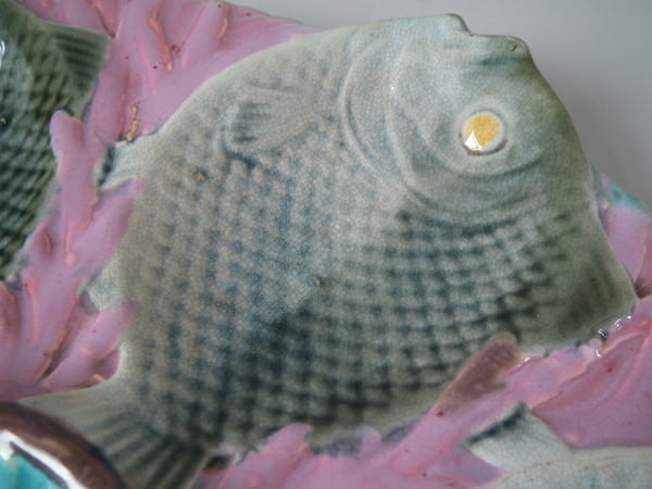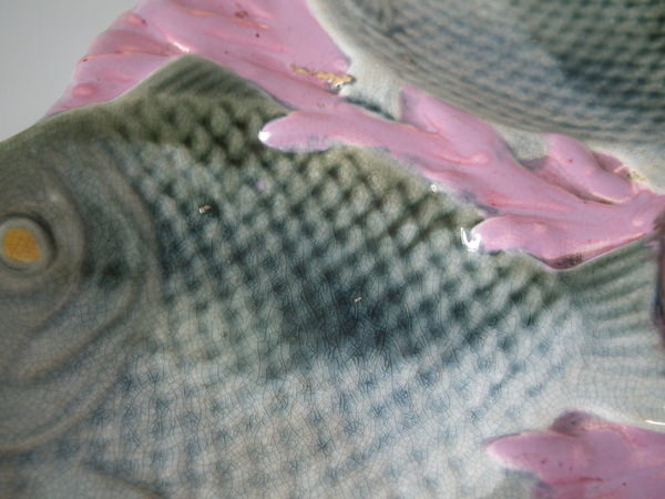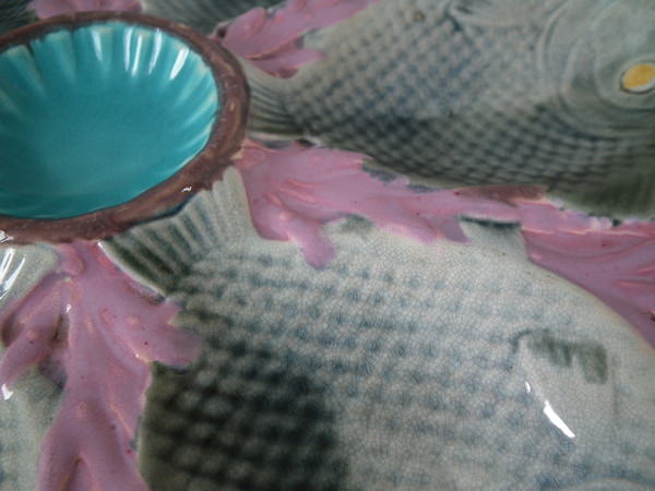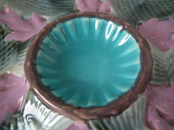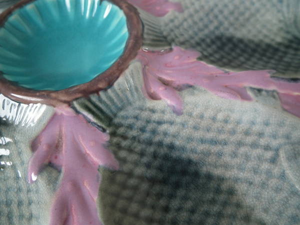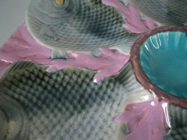 Victorian, circa 1886. 11ins high, 11ins wide, 0.9ins depth. Mintons Majolica oyster plate which features six fish wells.