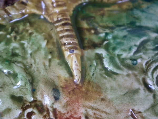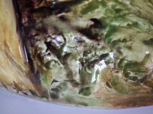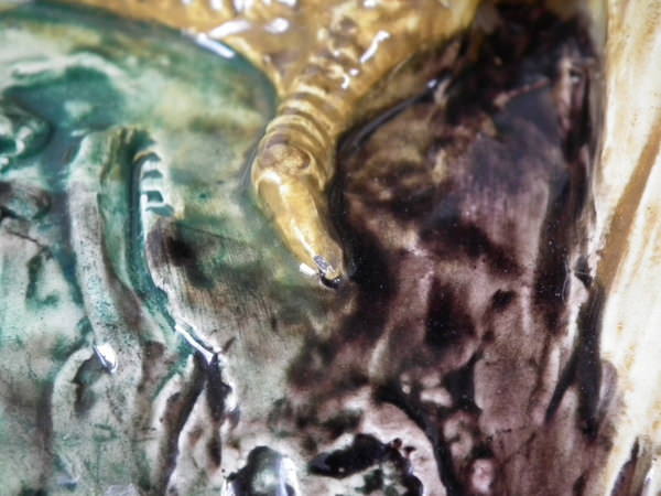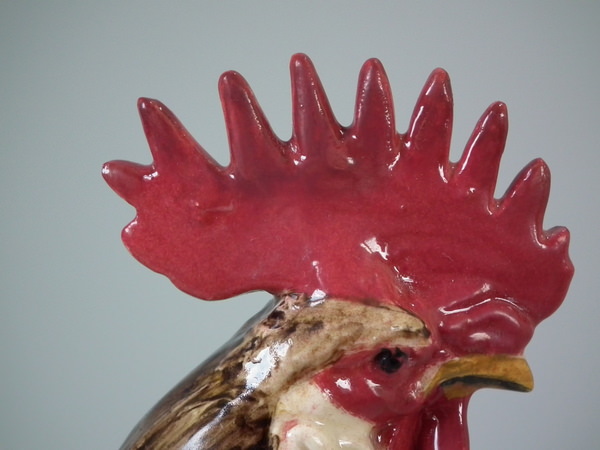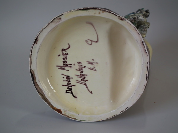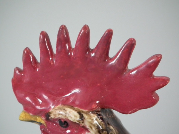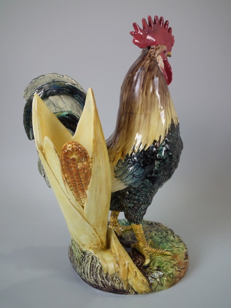 Delphin Massier Majolica spill vase which features cockerel/rooster stood in front of the vase modelled in the form of corn.