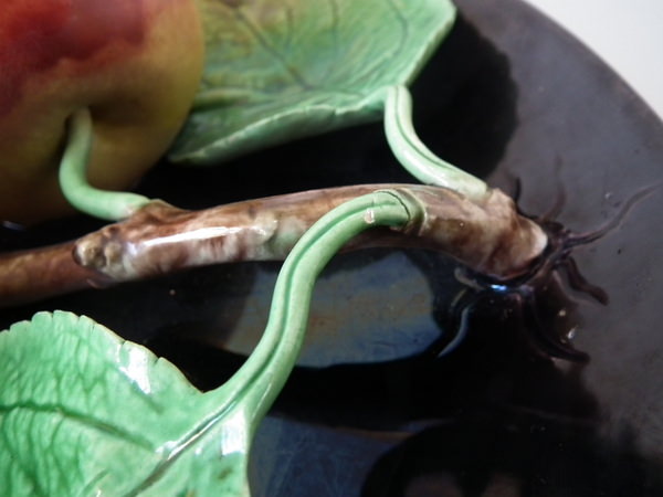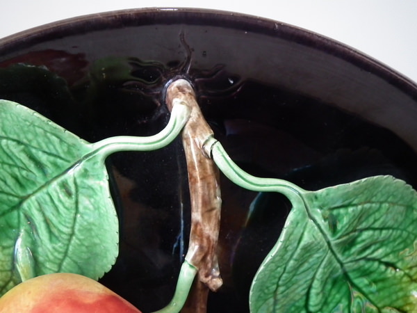 Early 20thC, circa 1920. 10.8ins high, 10.8ins wide, 1.7ins depth. Unidentified Portuguese Portuguese Palissy Majolica wall plate which features apples and leaves. Colouration: brown, green, red, are predominant.