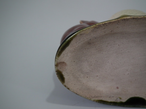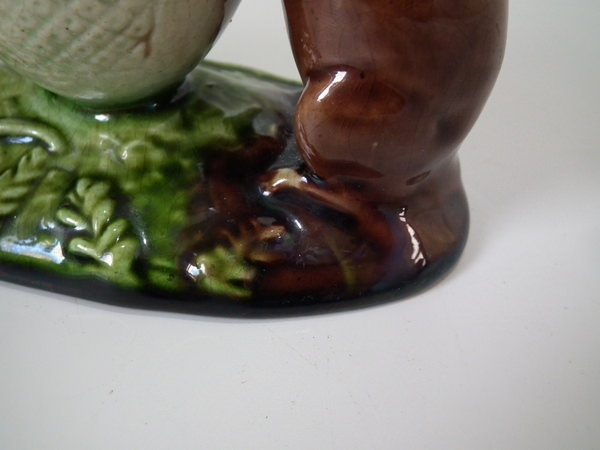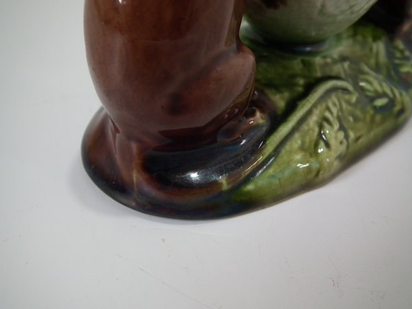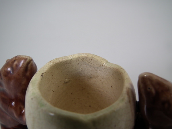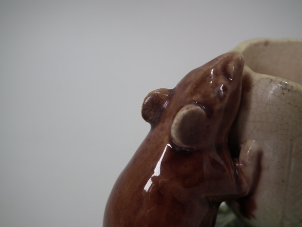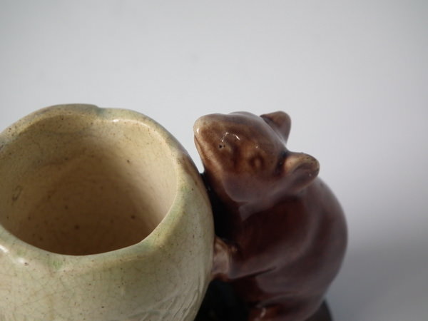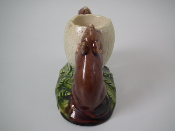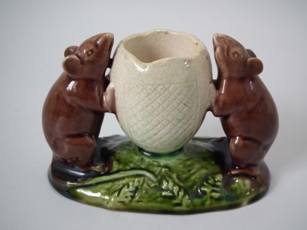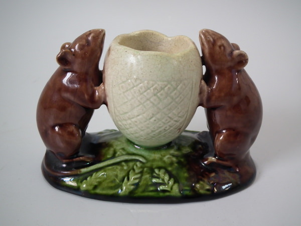 Victorian, circa 1880. 3ins high, 4.3ins wide, 2.4ins depth. Watcombe Majolica posy holder which features two mice supporting an egg shell. Colouration: brown, green, cream, are predominant.
