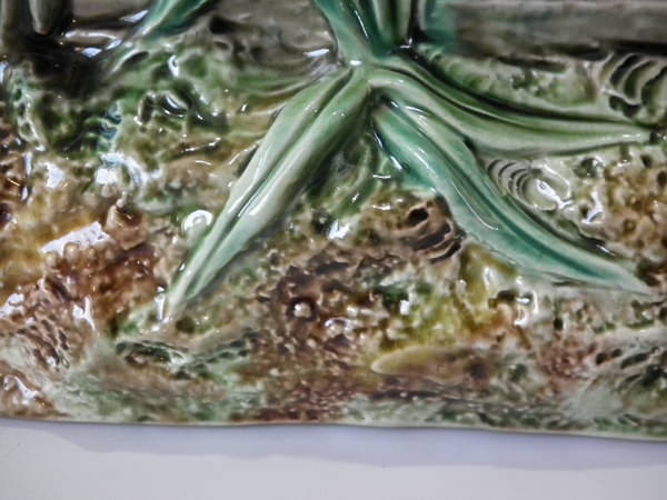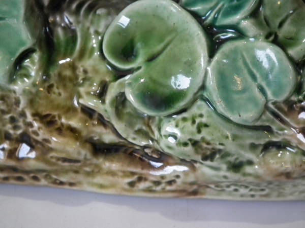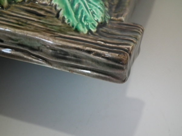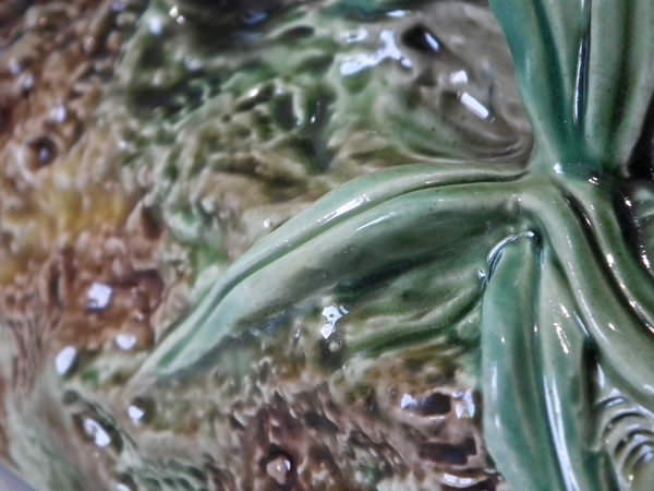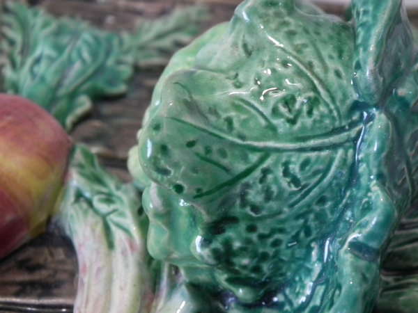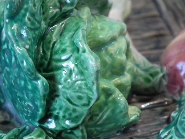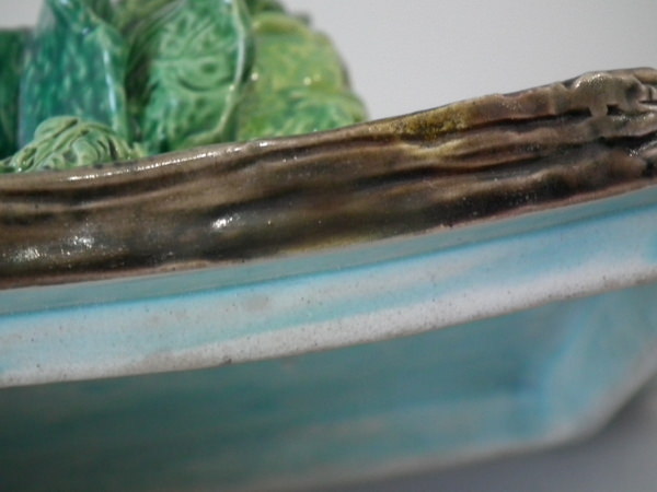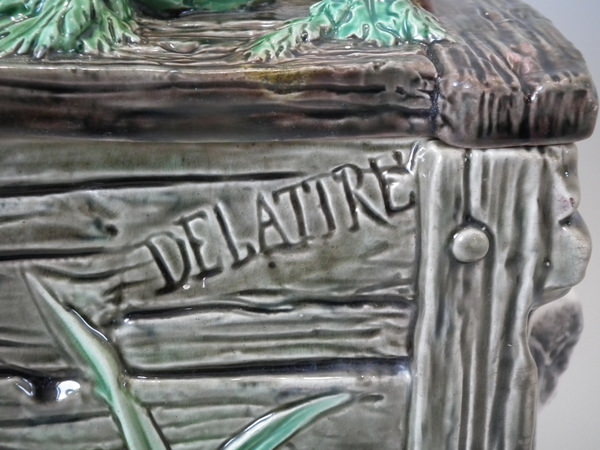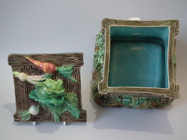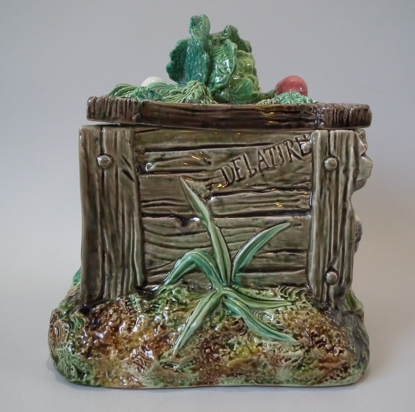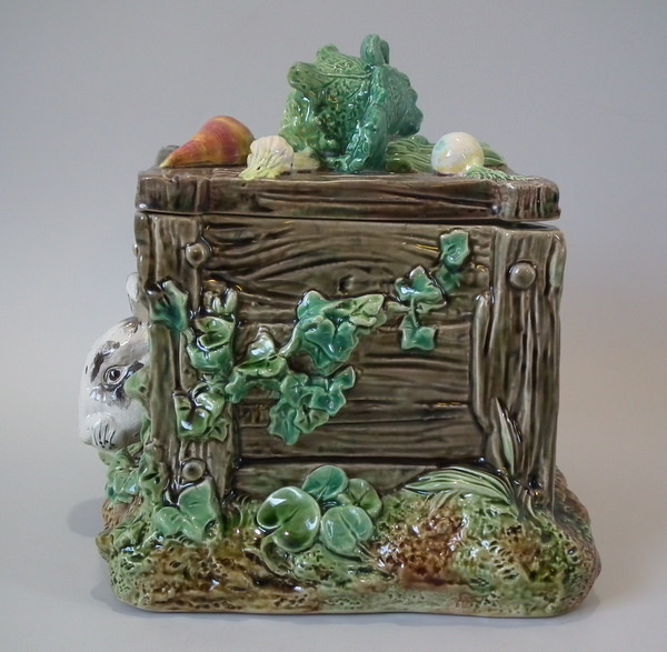 Brown Westhead Moore & Co Majolica box and cover which features a rabbit in a crate, with vegetables on top.