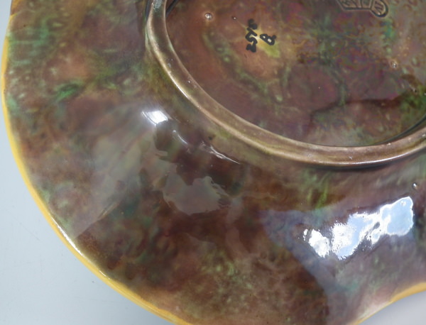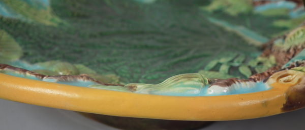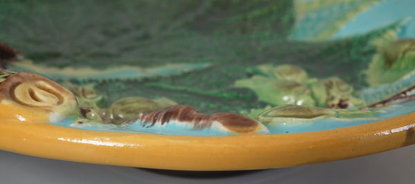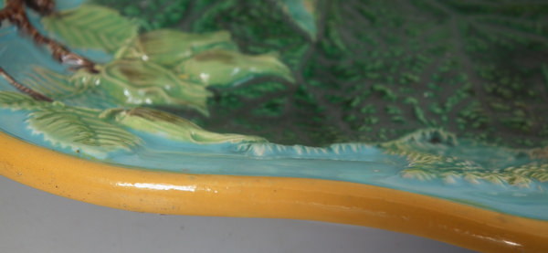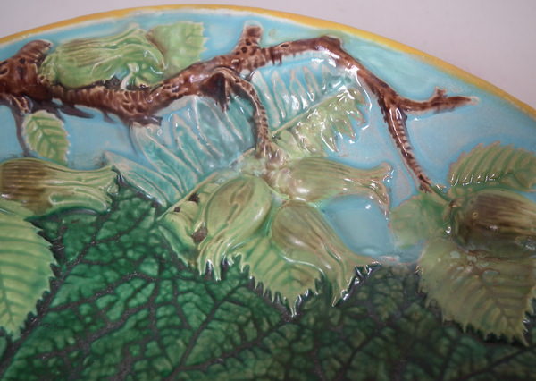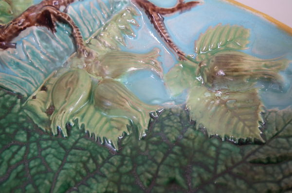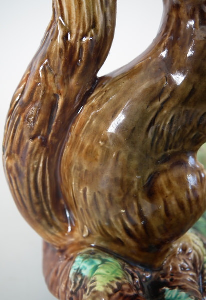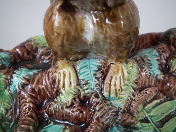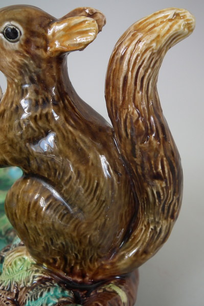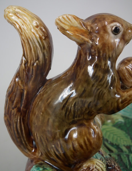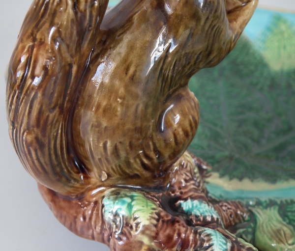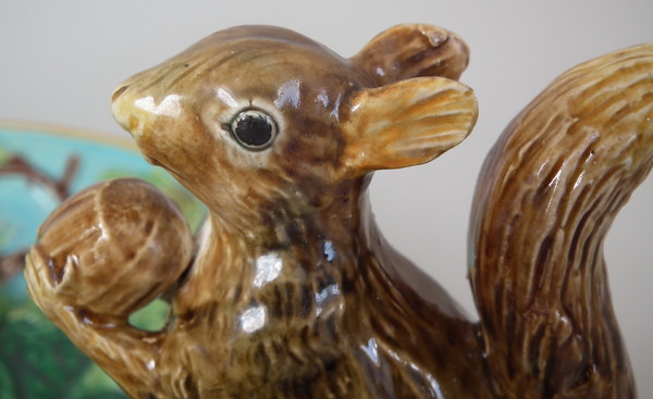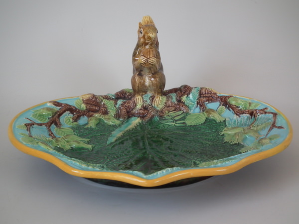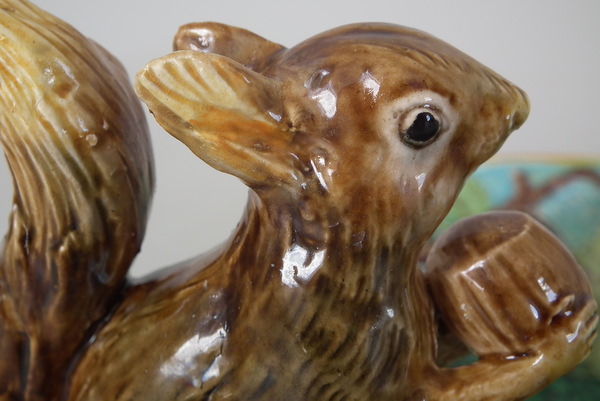 Victorian, circa 1869. 4.6ins high, 10.4ins wide, 9.2ins depth. George Jones Majolica nut dish which features a squirrel holding a nut. Turquoise ground version. Colouration: green, brown, turquoise, are predominant.