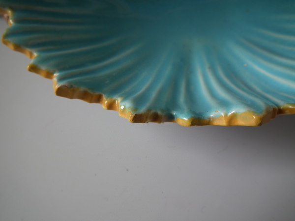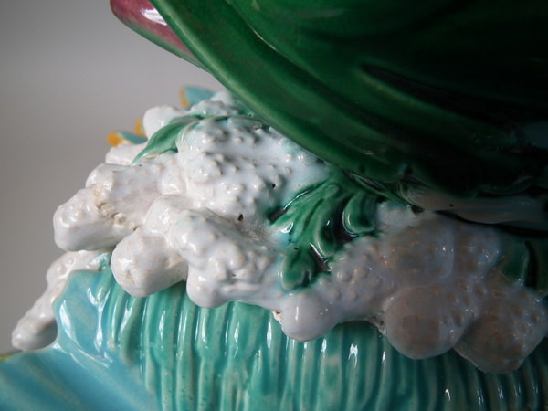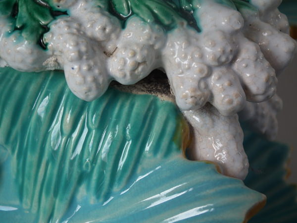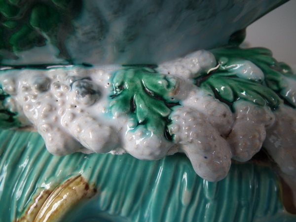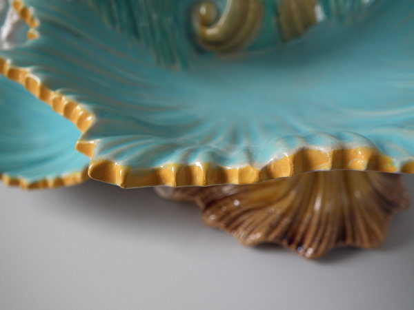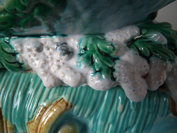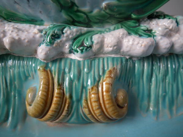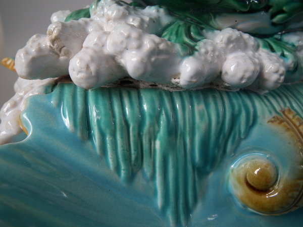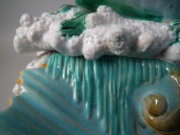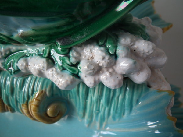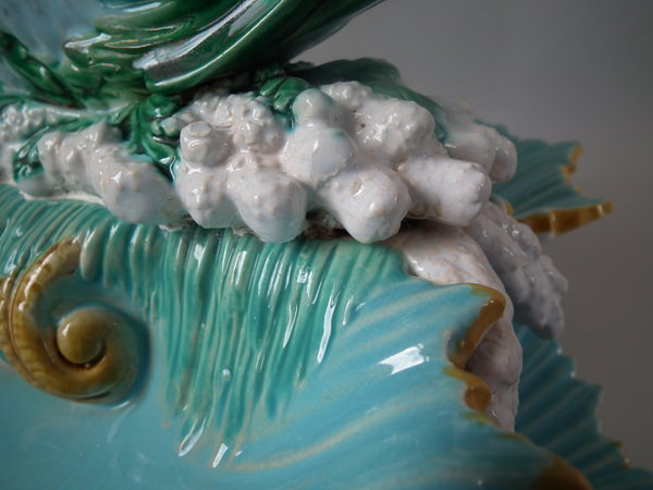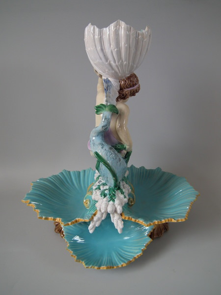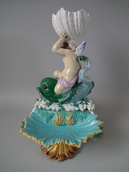 Victorian, circa 1870. 16.1ins high, 14ins wide, 11.4ins depth. George Jones Majolica centrepiece which features a putti supporting a shell whilst a dolphin on a bed of coral and four shells.