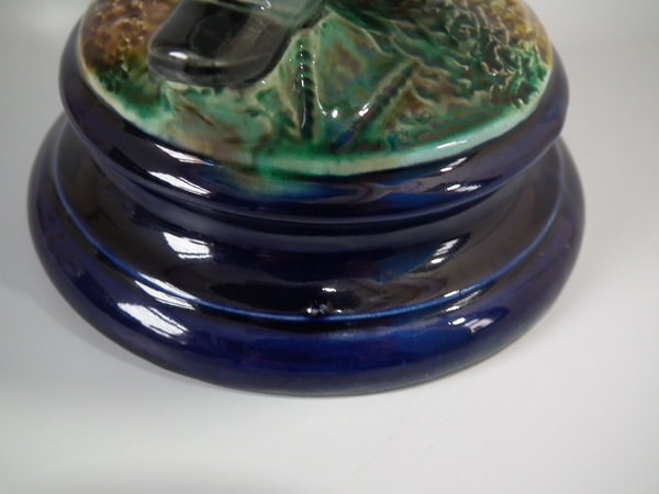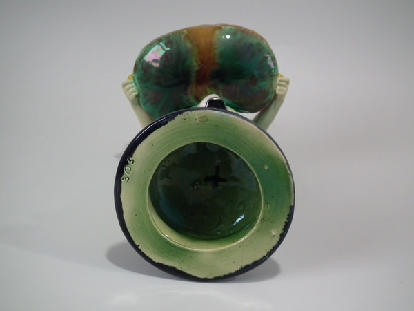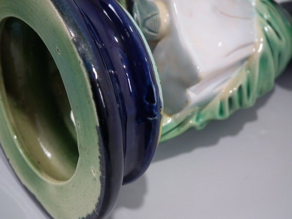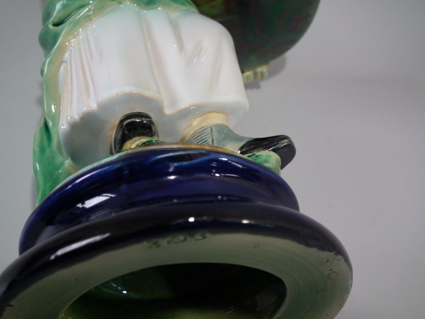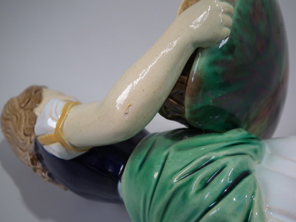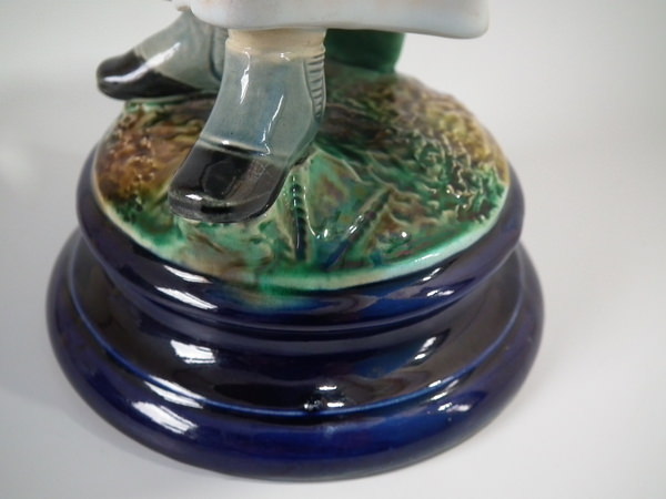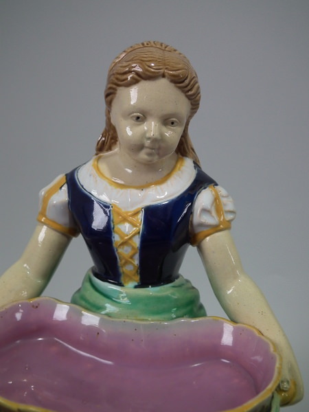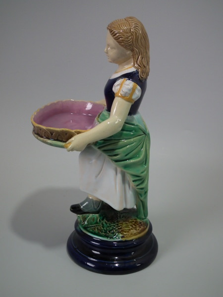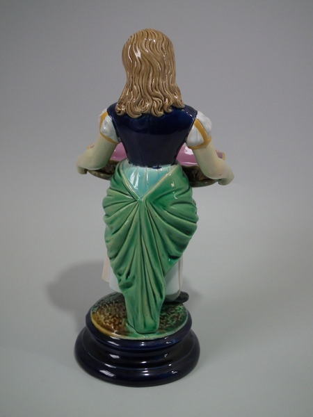 Victorian, circa 1880. 9.4ins high, 4.7ins wide, 4.9ins depth. Holdcroft Majolica figural which features a girl, wearing traditional dress, holding a basket.