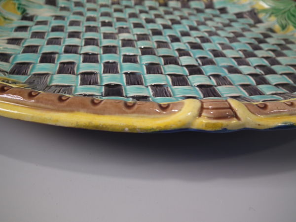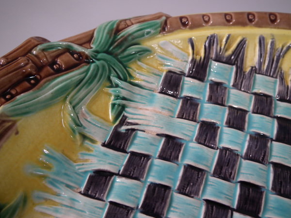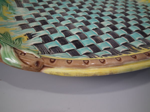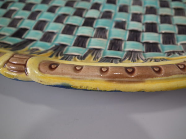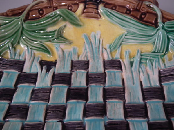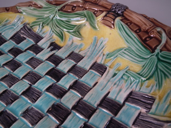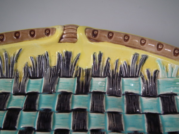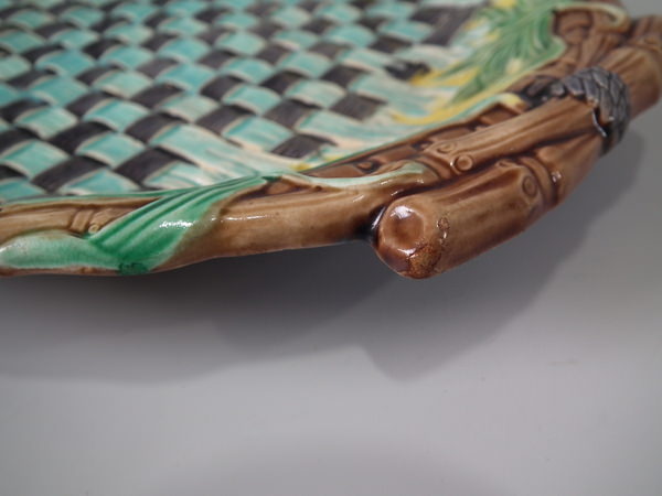 Victorian, circa 1878. 8.9ins high, 12.6ins wide, 1.4ins depth. Wedgwood Majolica platter which features tied bamboo stem handles and a woven napkin to the centre.