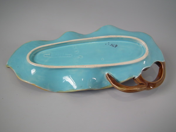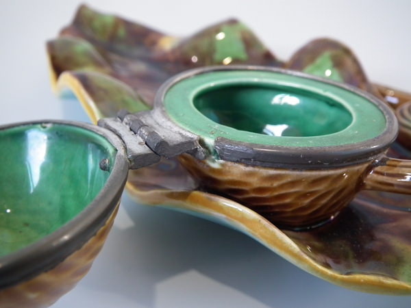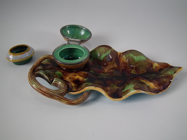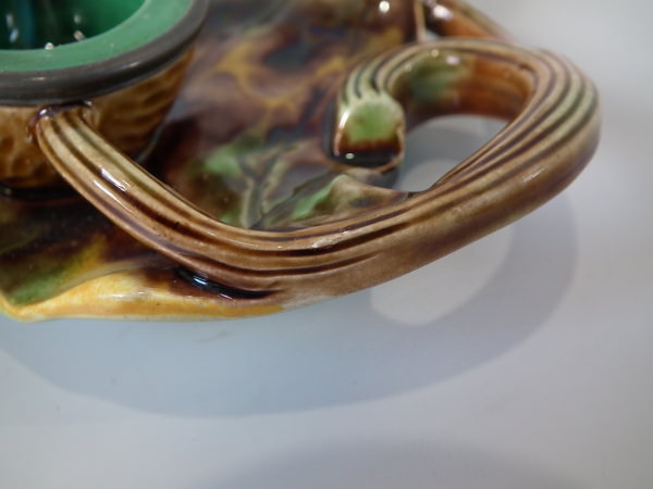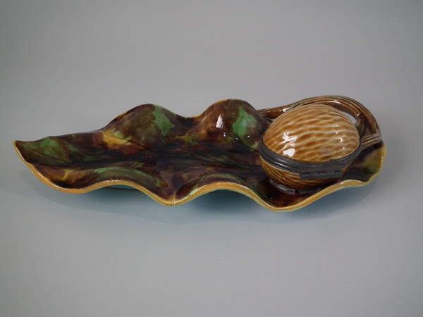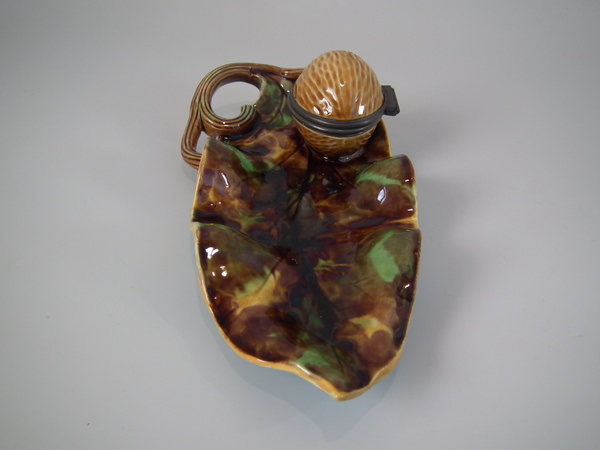 Victorian, circa 1870. 2.4ins high, 9.4ins wide, 4.7ins depth. Brown Westhead Moore & Co Majolica inkwell which features a walnut on a large leaf.