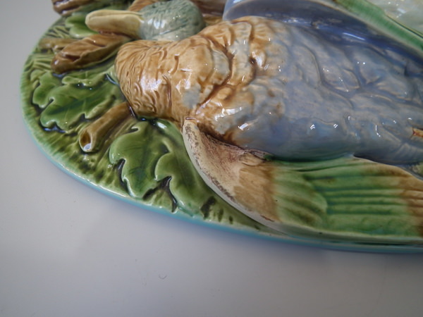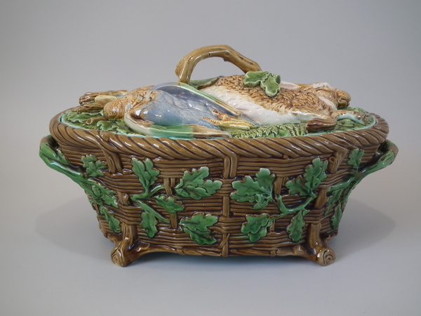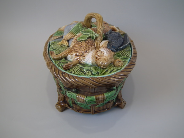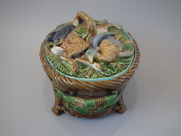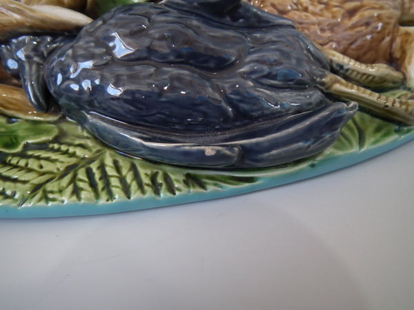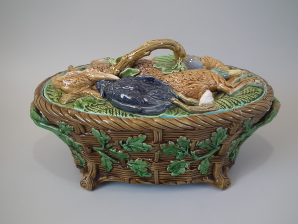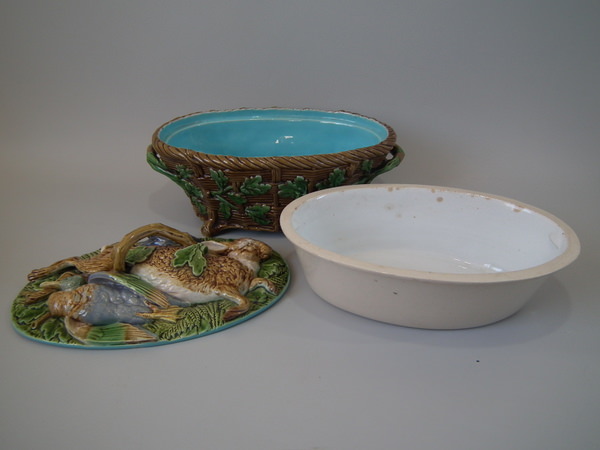 Minton Majolica game pie dish with liner which features a hare, mallard and blackbird on a bed of fern and oak leaves.