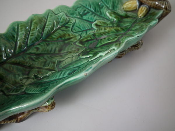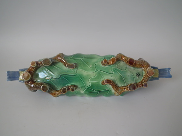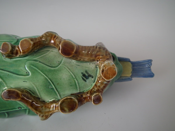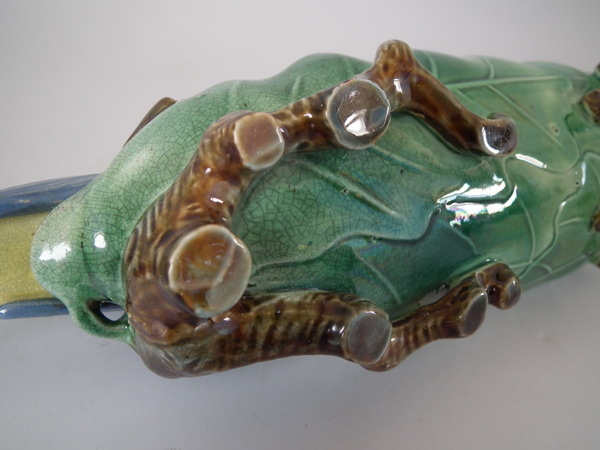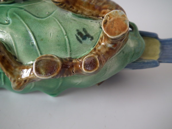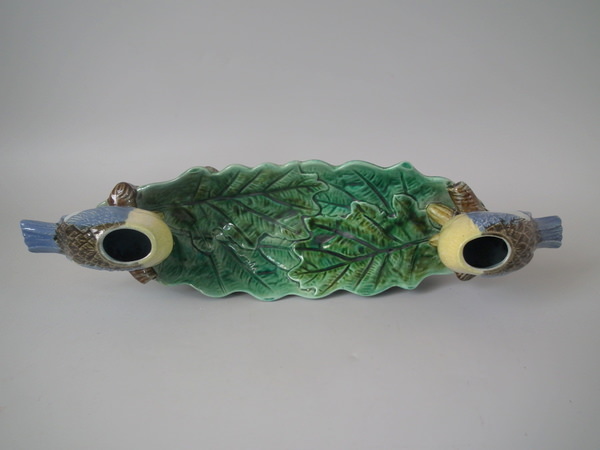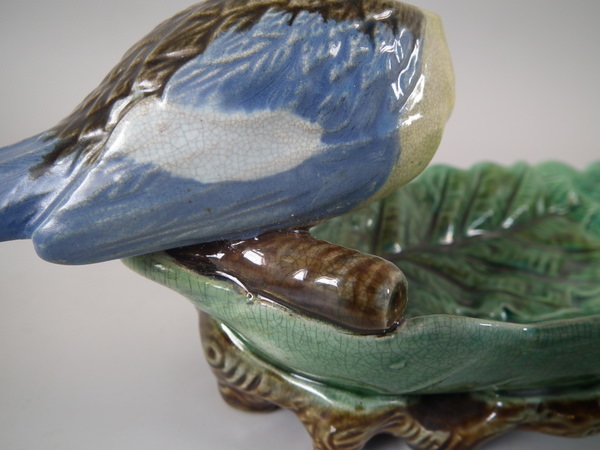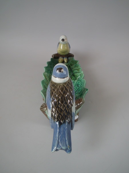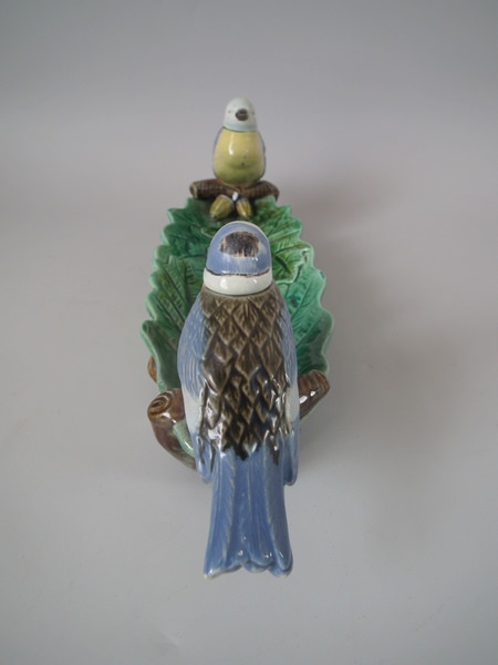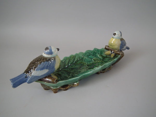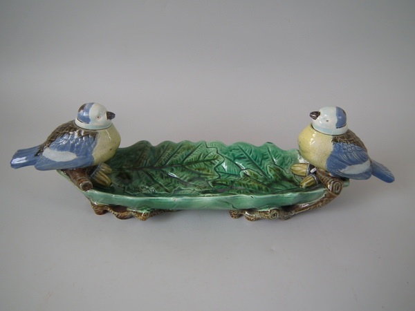 Victorian, circa 1870. 3.9ins high, 13ins wide, 3.5ins depth. Holdcroft Majolica inkwell which features two blue tits