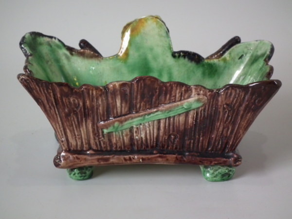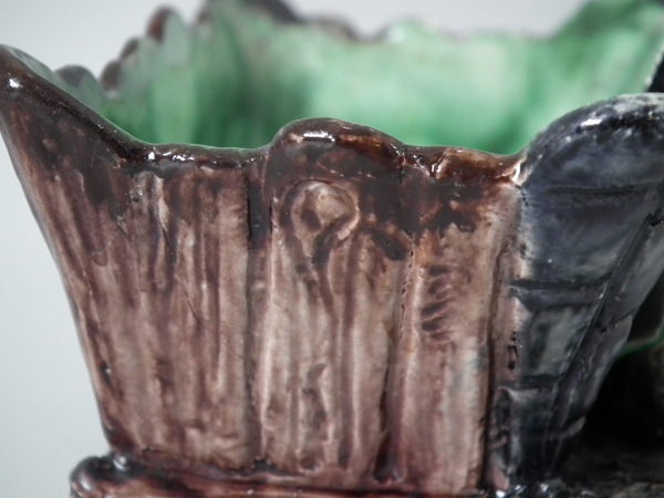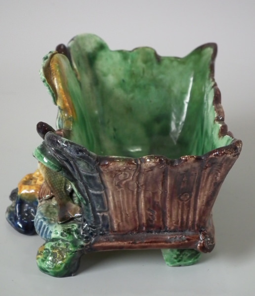 Thomas Sergent Majolica planter which features a fish and bulrushes.