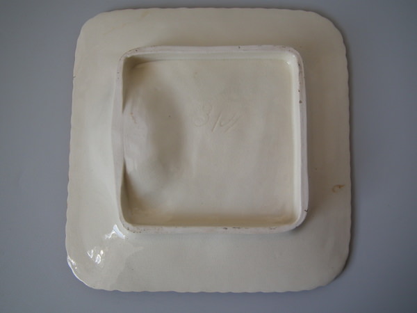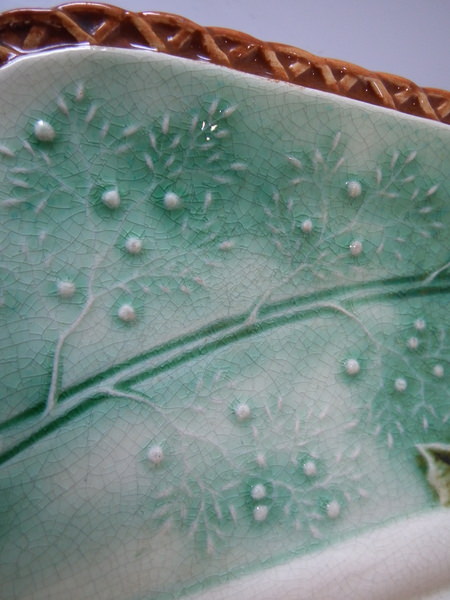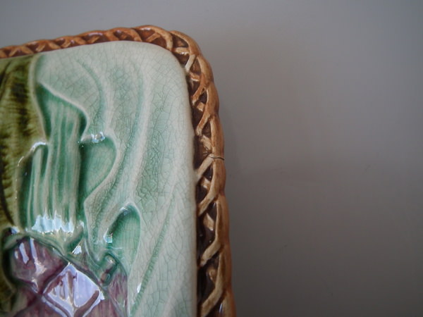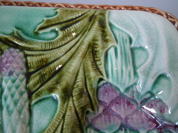 Victorian, circa 1890. 9.2ins high, 9.2ins wide, 1.1ins depth. Majolica plate which features asparagus, leaves, and a well decorated with an artichoke.