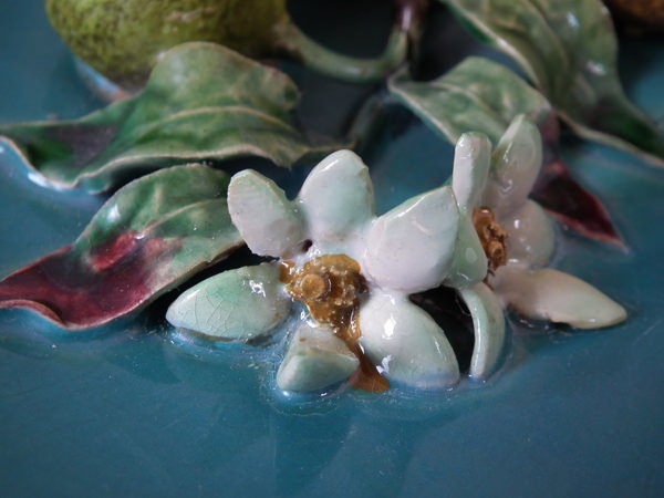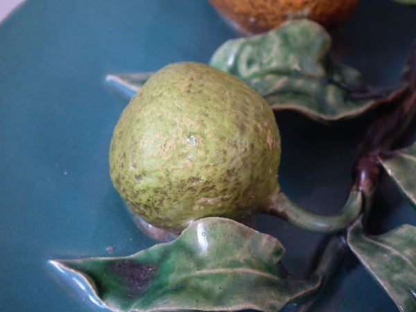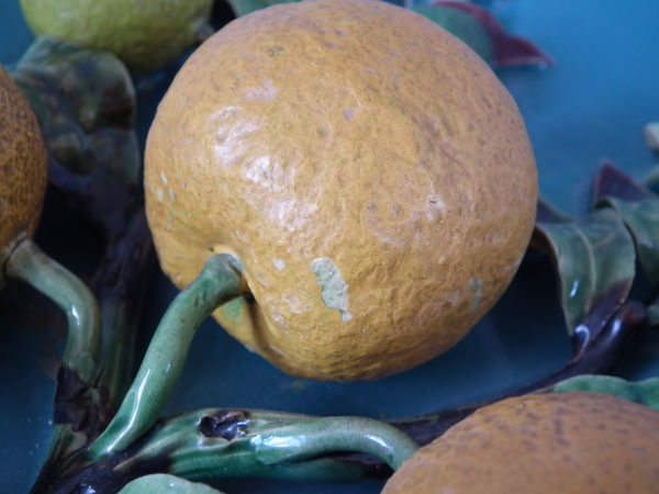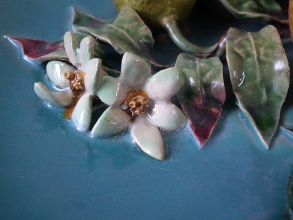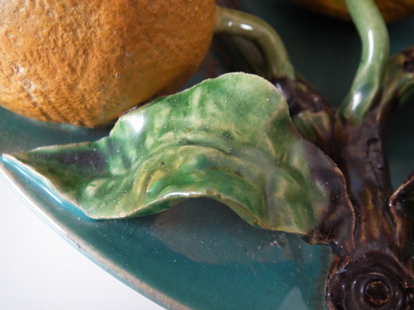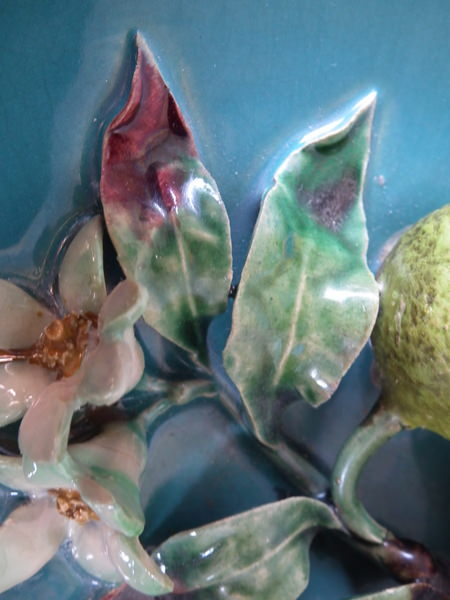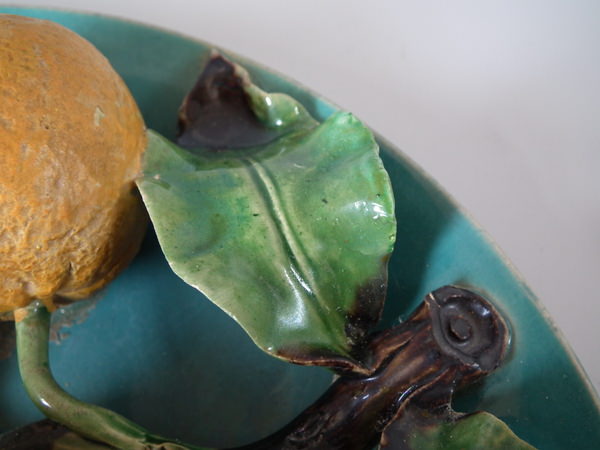 Victorian, circa 1880. 9.6ins high, 9.6ins wide, 2.6ins depth. Menton Majolica wall plate which features orange, lemon and lime fruits, leaves and flowers.