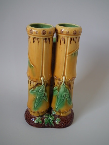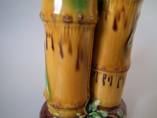 Victorian, circa 1868. 6.2ins high, 3.3ins wide, 3ins depth. Minton Majolica spill vase which features bamboo.
