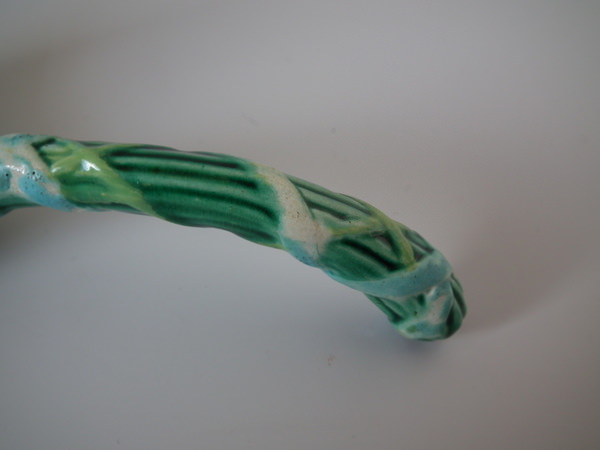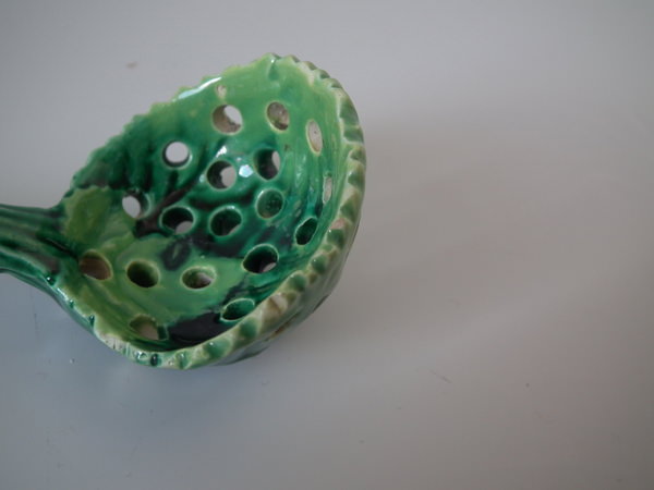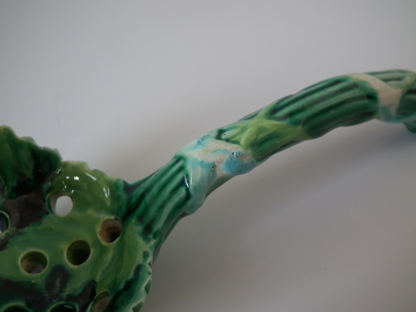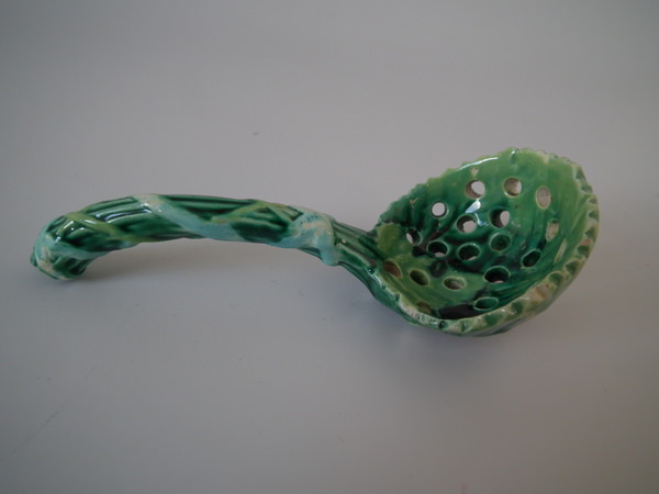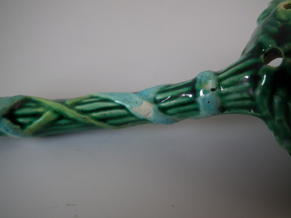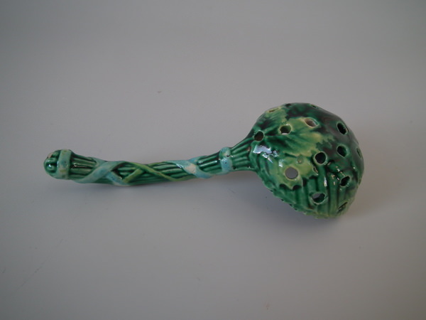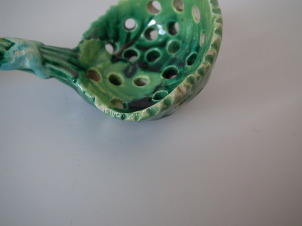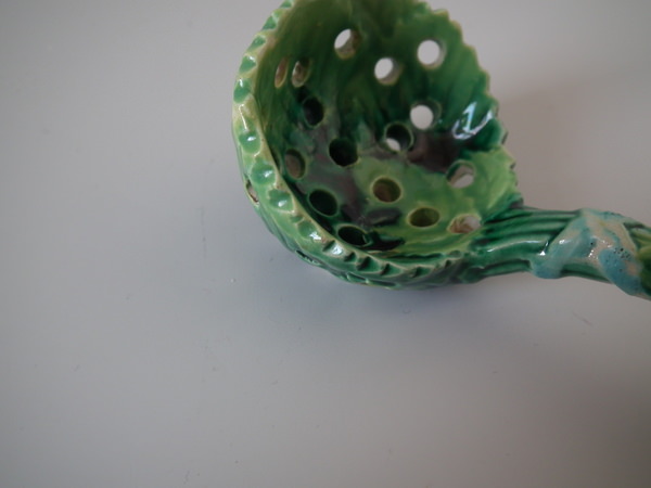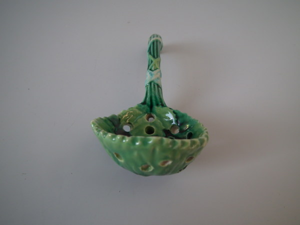 Victorian, circa 1870. 4.1ins high, 1.8ins wide, 1.8ins depth. George Jones Majolica spoon which features overlapping strawberry leaves tied with ribbon.