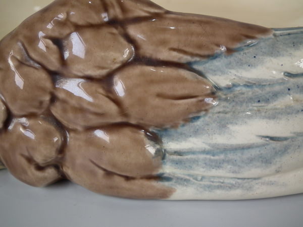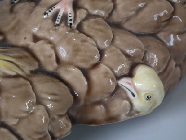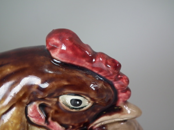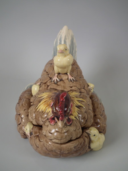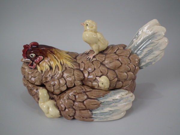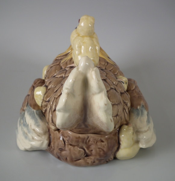 Unidentified French Majolica egg tureen and cover which features a hen with her six chicks.
