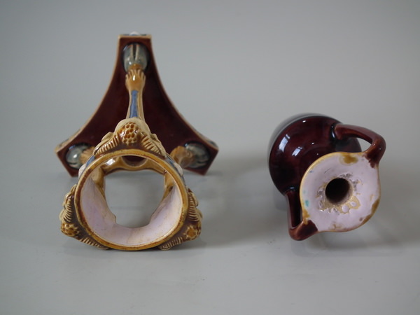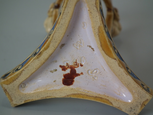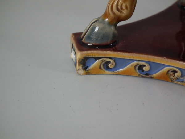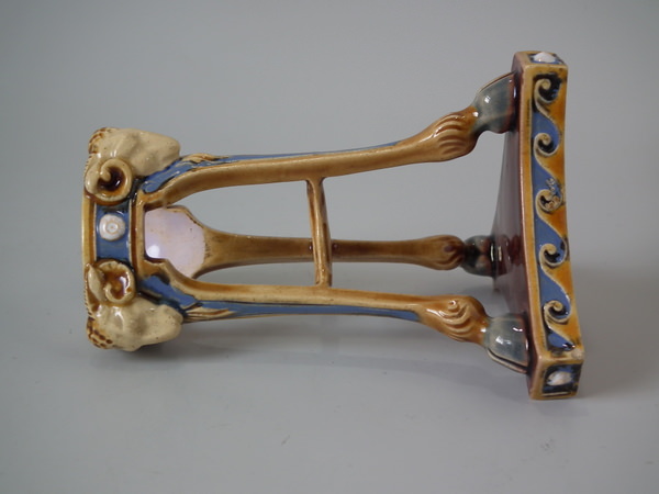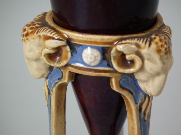 Minton Majolica vase which features ram's heads and hoof feet.