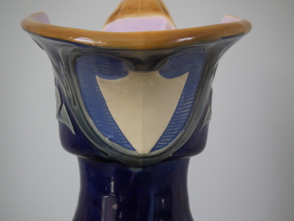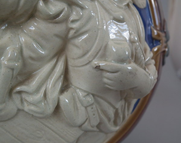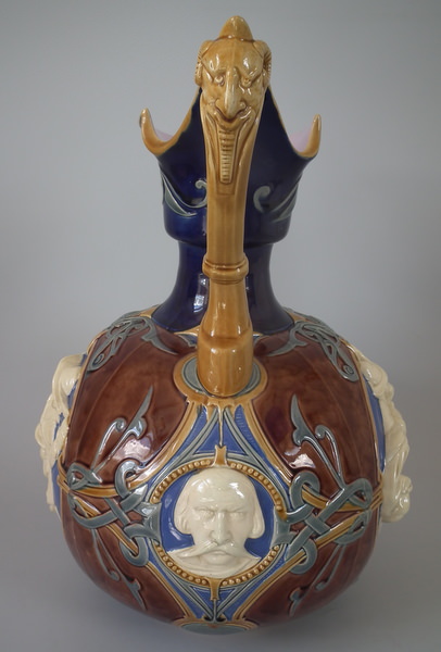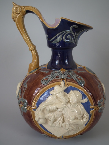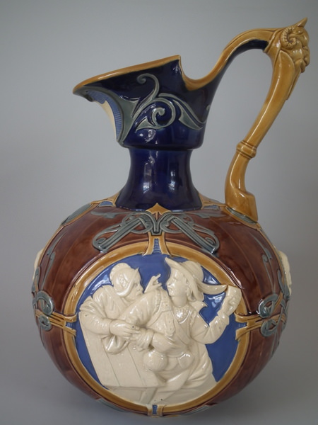 Victorian, circa 1879. 13.9ins high, 10ins wide, 9.4ins depth. Mintons Majolica ewer which features cavaliers and soldiers drinking. Colouration: brown, ochre, cobalt blue, are predominant.