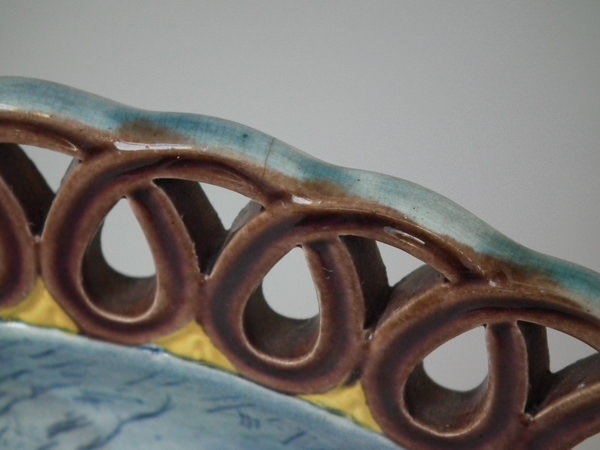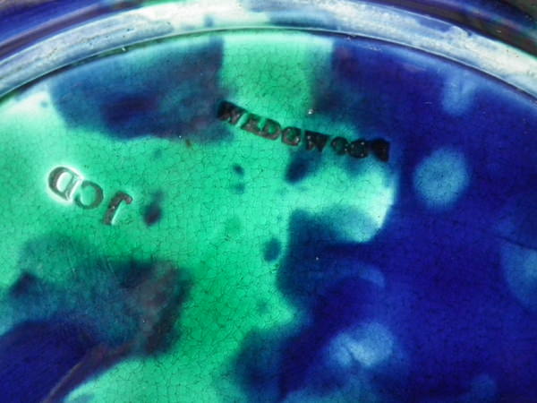 Colouration: blue, brown, ochre, are predominant. The piece bears maker's marks for the Wedgwood pottery.