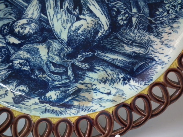 Wedgwood Majolica plate which features a pictorial scene of a hound with game and a gun.