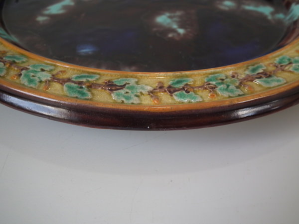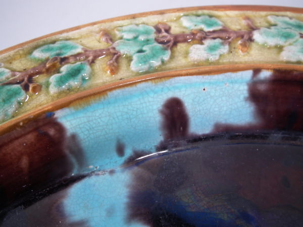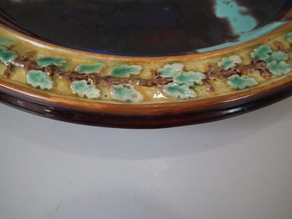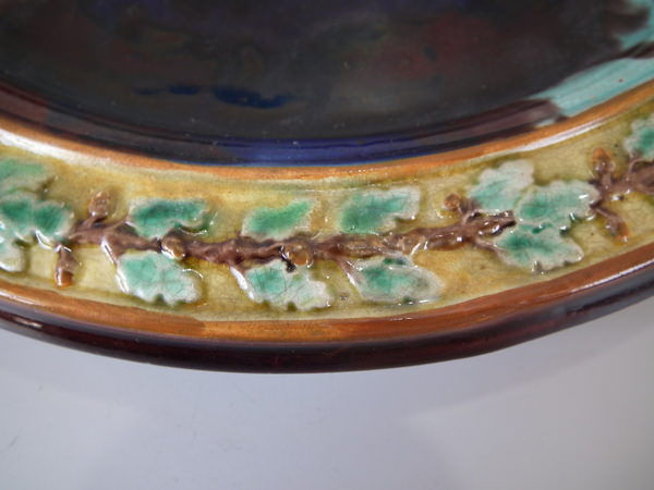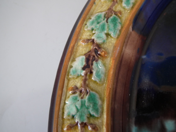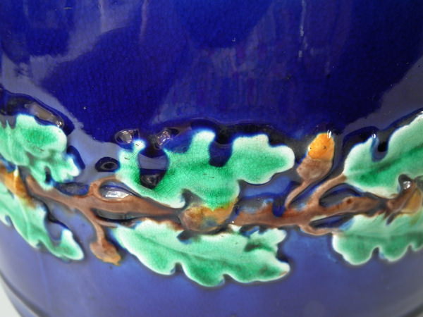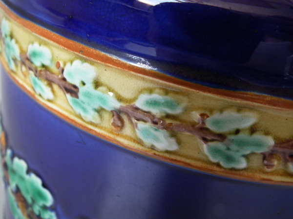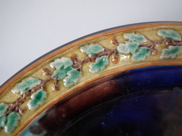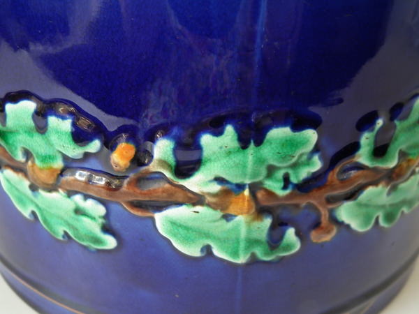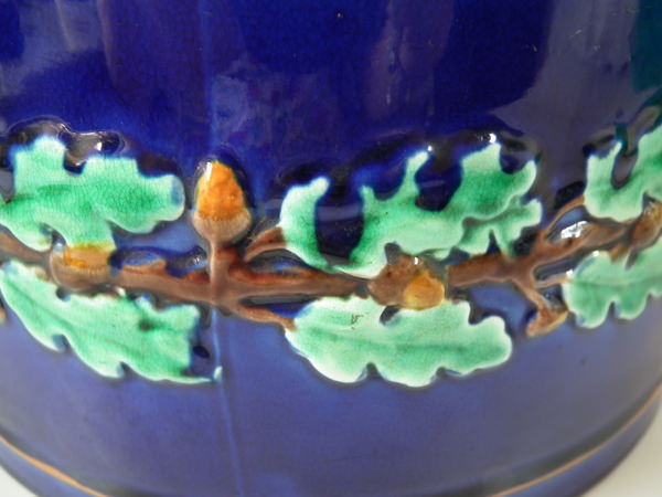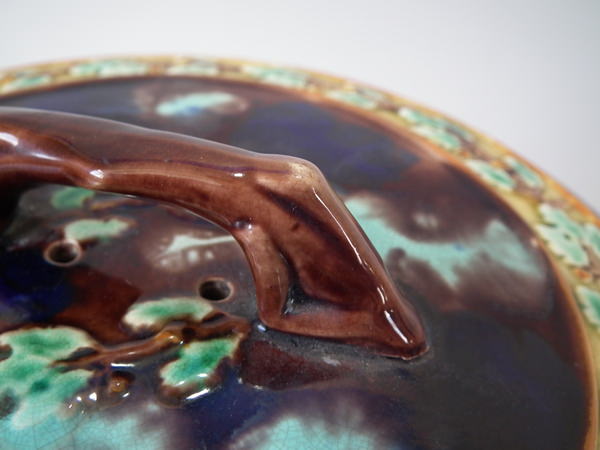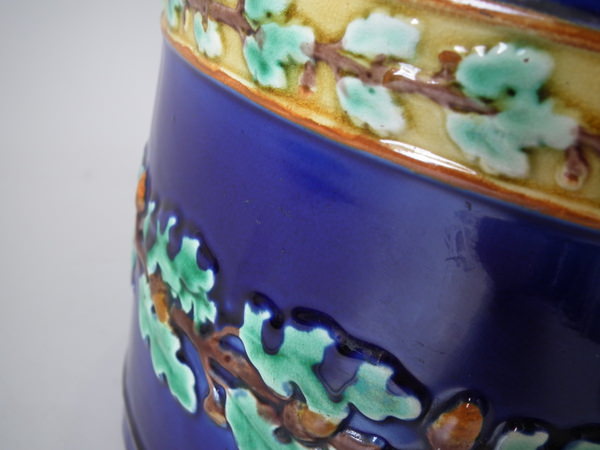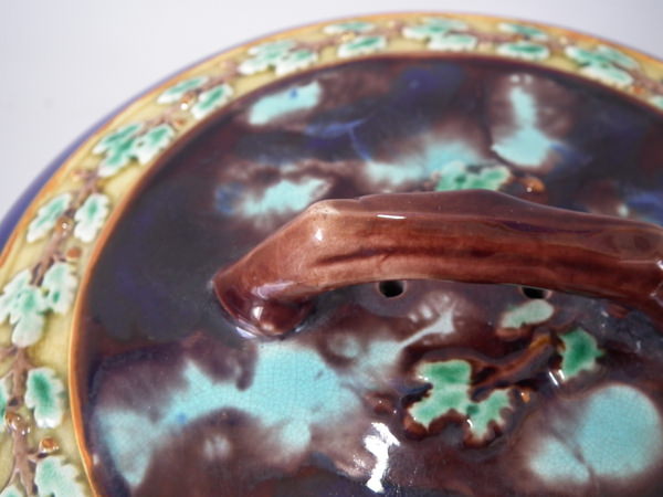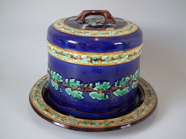 Victorian, circa 1874. 8.4ins high, 11.6ins wide, 11.6ins depth. Wedgwood Majolica cheese keep which features oak leaves and acorns.